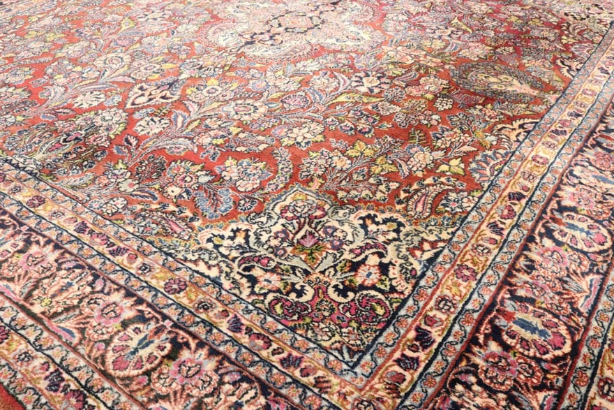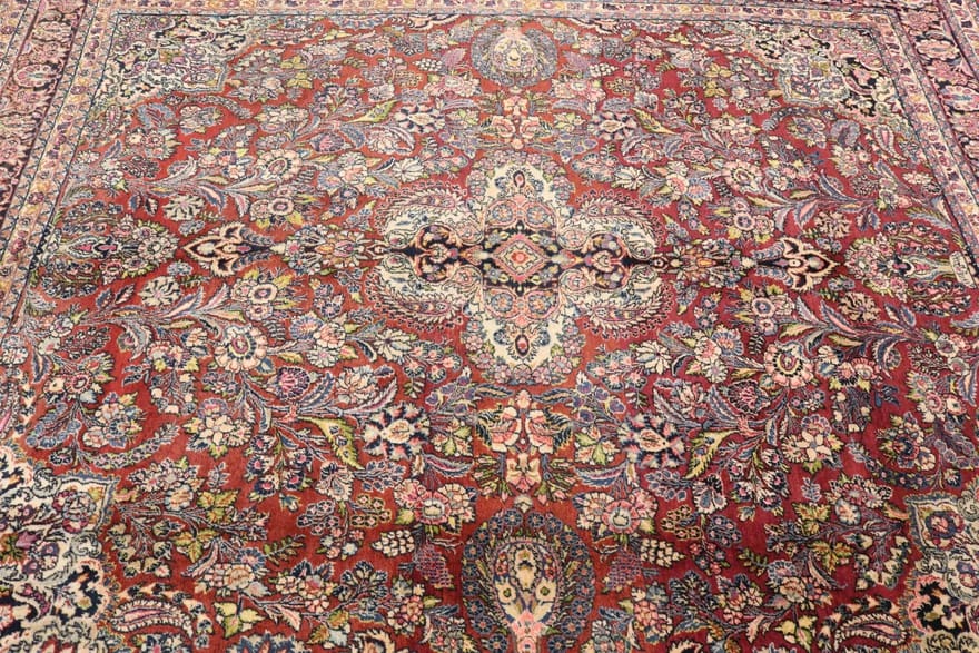 Antiker Shahrbaft Perserteppich | Knotendichte: 200.000 – 250.000 Knoten/m² | Material: Hochwertige Wolle und Seide | Größe: 359×321 cm | Zustand: Antik | Design: Filigrane Blumenmotive und Medaillonmuster | Herkunft: Iran/Persien | Gewicht: ca. 40 kg | Dicke: ca. 12 mm