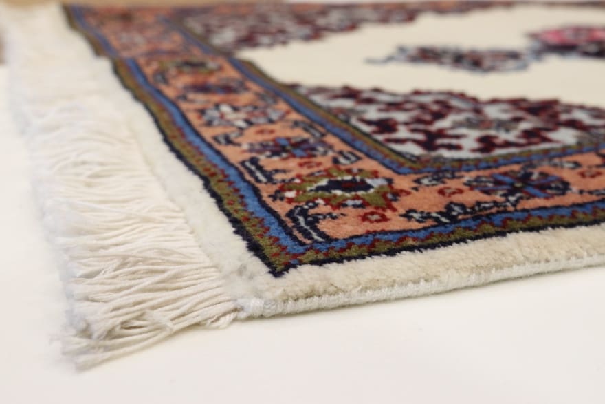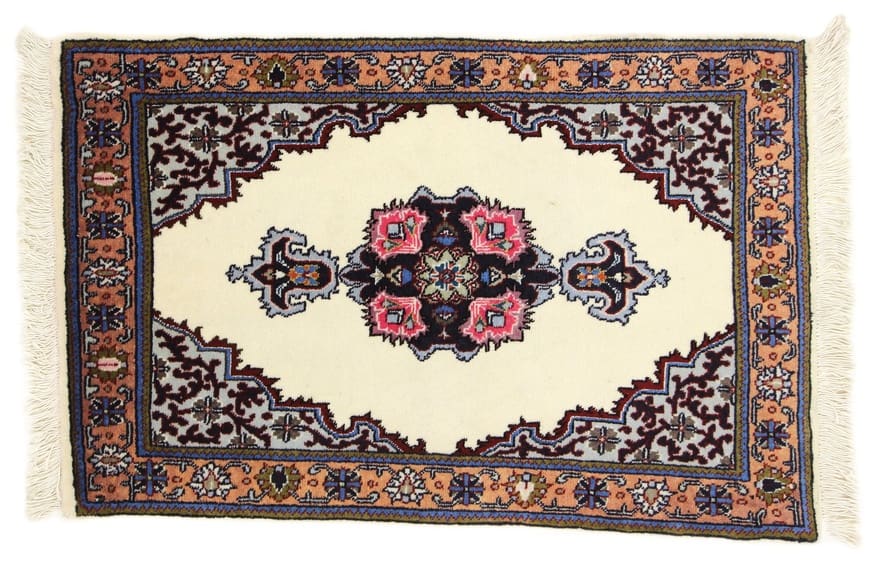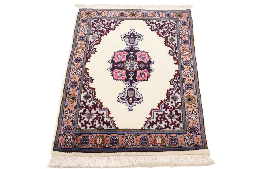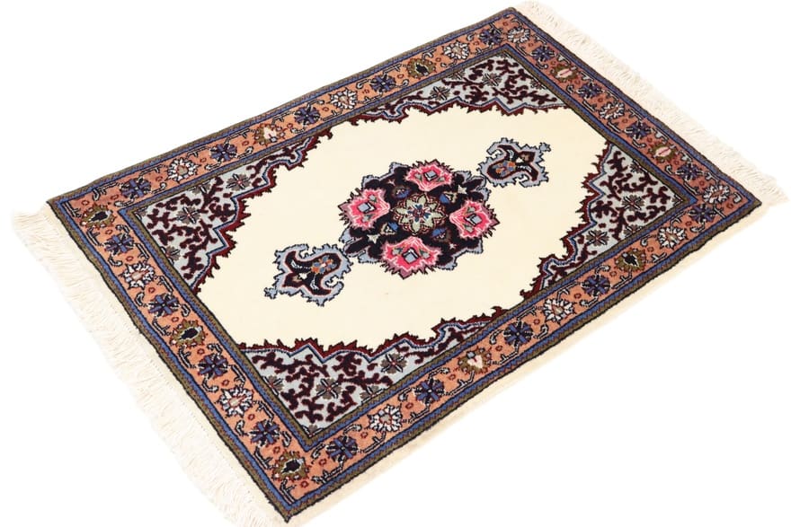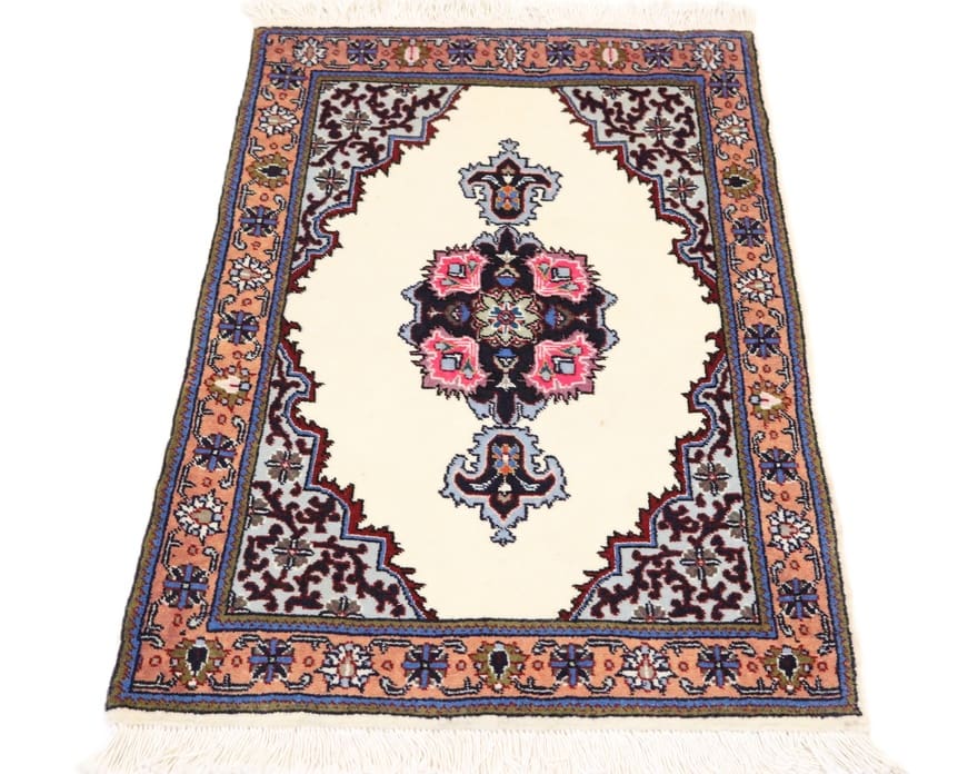 Alter: Neuzeitlich (0-20 Jahre) | Knotendichte: 320.000 – 360.000 Knoten/m² | Material: Handgeknüpfte Wolle | Größe: 89×57 cm | Farbe: Weiß/Beige | Design: Florales Medaillon-Muster | Ursprung: Iran/Persien | Zustand: Exquisit und zeitlos | Gewicht: ca. 4 kg