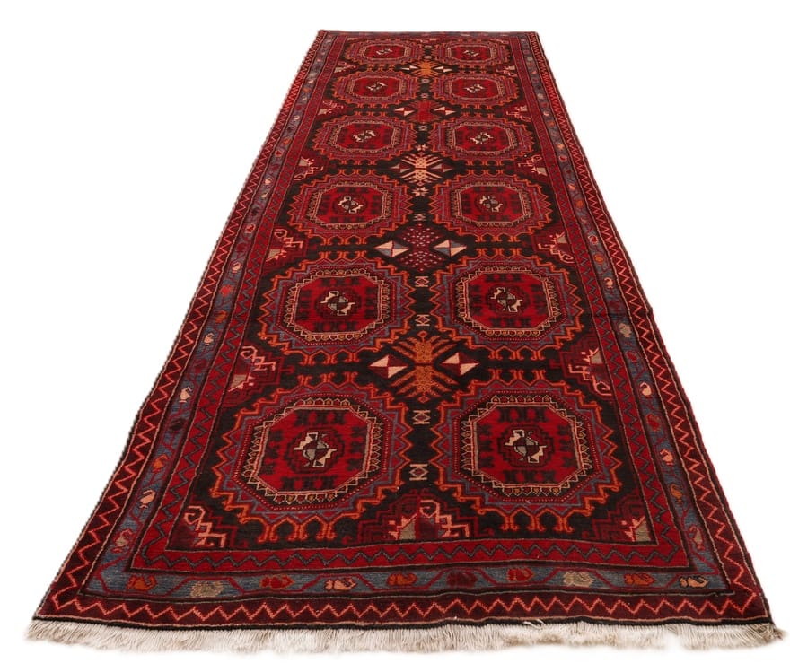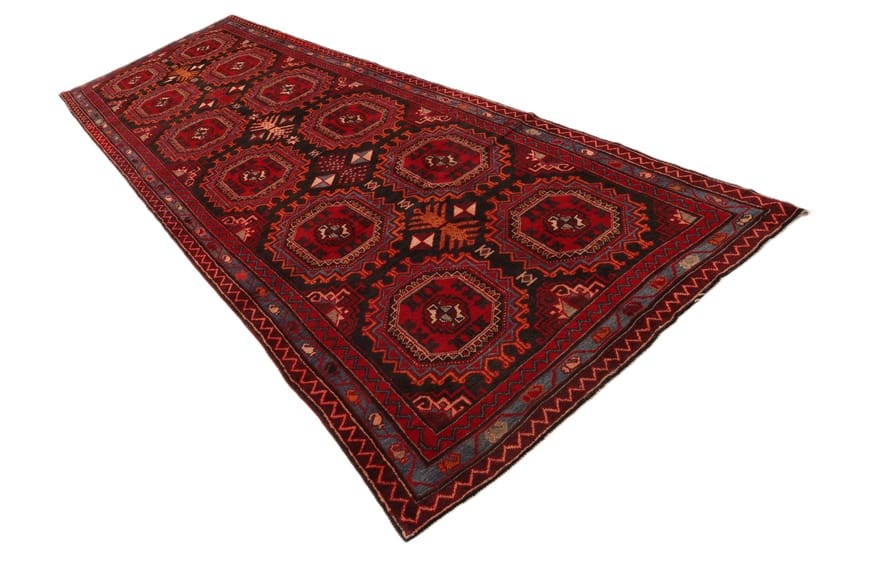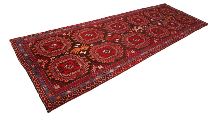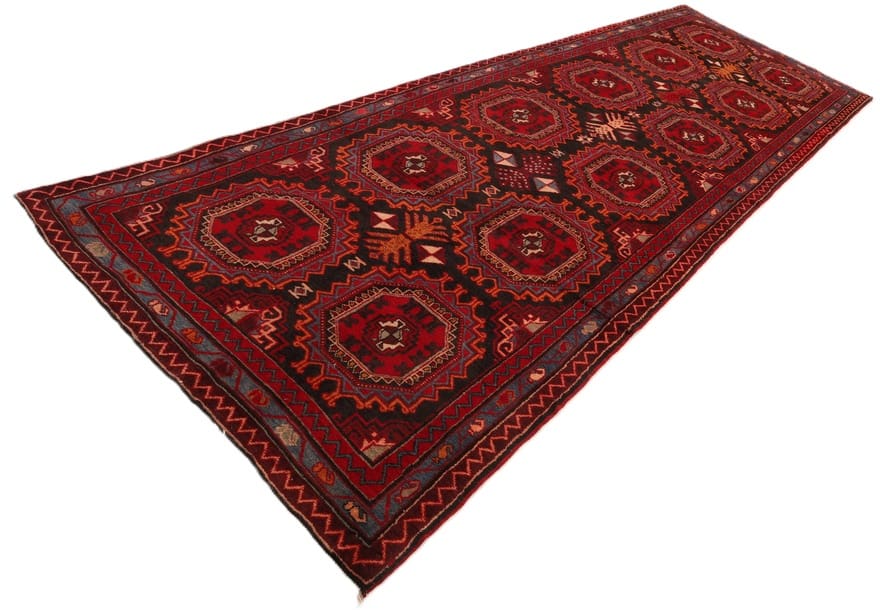 Handgeknüpfter Azerbeijan Teppich | Größe: 427×141 cm | Knotendichte: 128.000 – 160.000 Knoten/m² | Material: Hochwertige Schurwolle | Herkunft: Iran / Persien | Zustand: Neuzeitlich (0-20 Jahre) | Farbe: Kräftig Rot und Schwarz | Ideal als Flurläufer oder in großen Gästezimmern