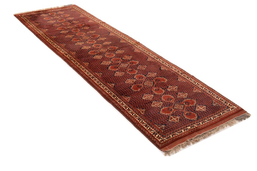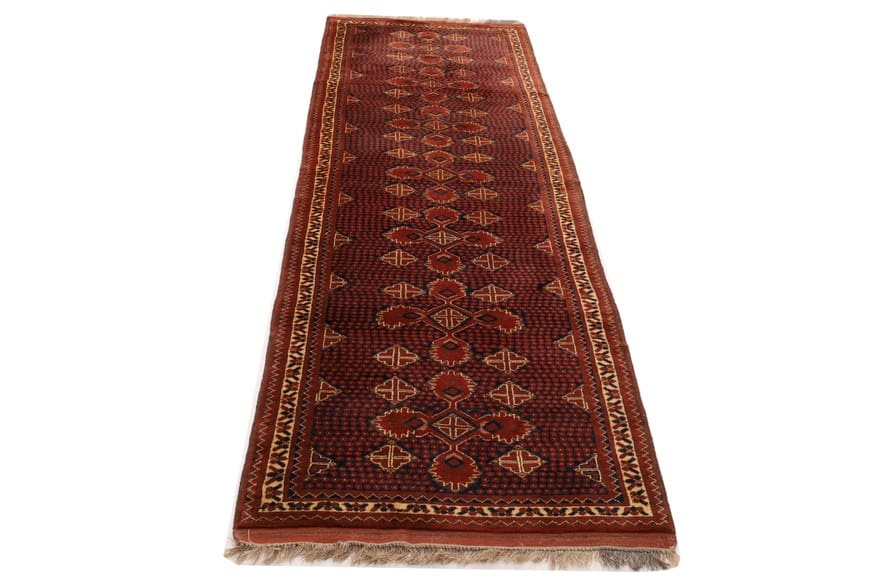 Handgewebter Beluch-Teppich | Knotendichte: 128.000-160.000 Knoten/m² | Material: 100 % Wolle | Größe: 324×98 cm | In neuem Zustand | Ursprung: Iran/Persien | Muster: Tribal-geometrisch | Farbe: Rot/Orange | Ideal für schmale Räume | Dicke: ca. 8 mm | Gewicht: ca. 7 kg