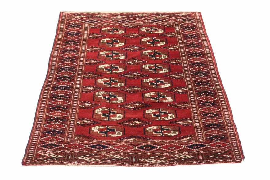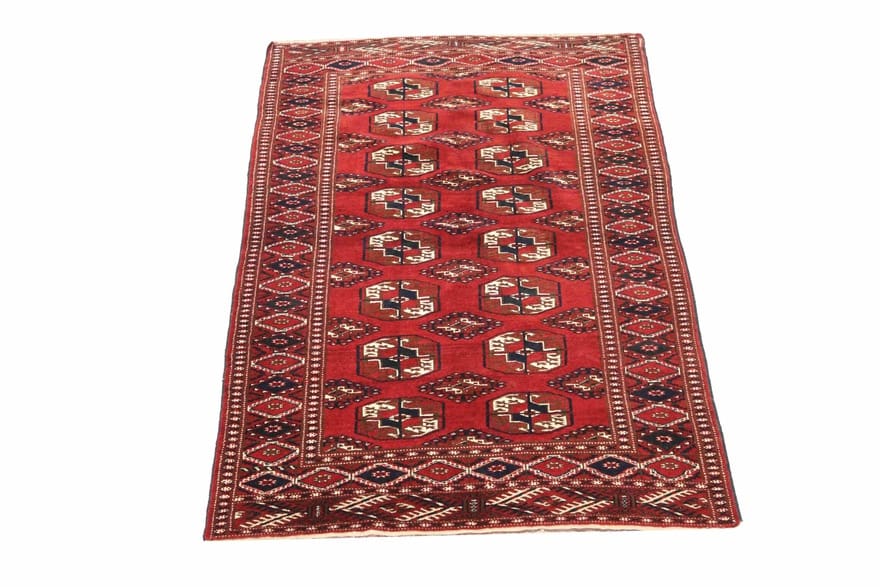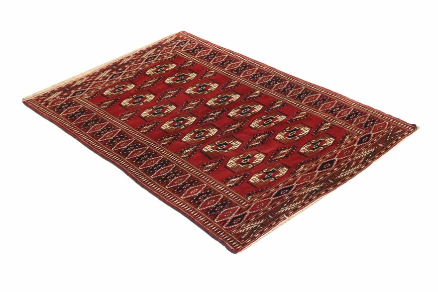 Buchara Teppich | Knotendichte: 200.000 – 250.000 Knoten/m² | Material: Handgesponnene Wolle und Baumwollkette | Größe: 172×116 cm | Farbe: Rot/Orange | Form: Rechteckig | Zustand: Neu | Ursprung: Iran/Persien | Verarbeitung: Handgeknüpft | Dicke: ca. 6 mm | Gewicht: ca. 4 kg