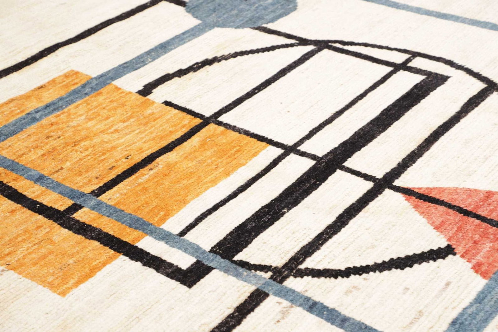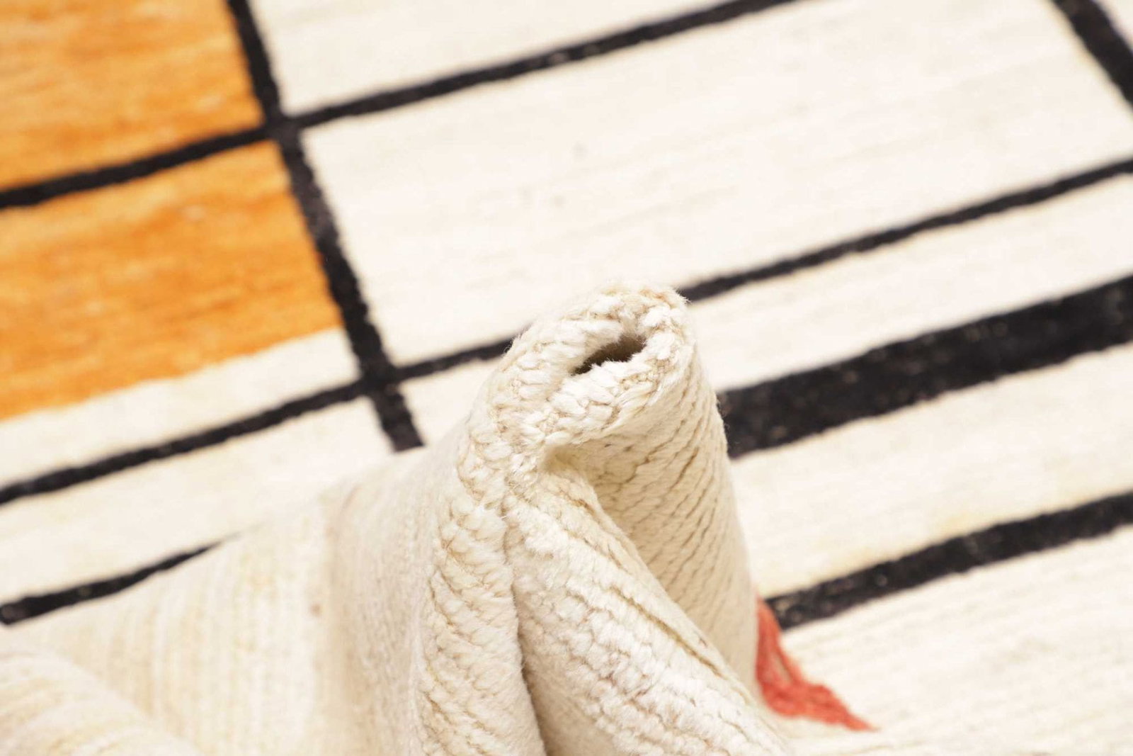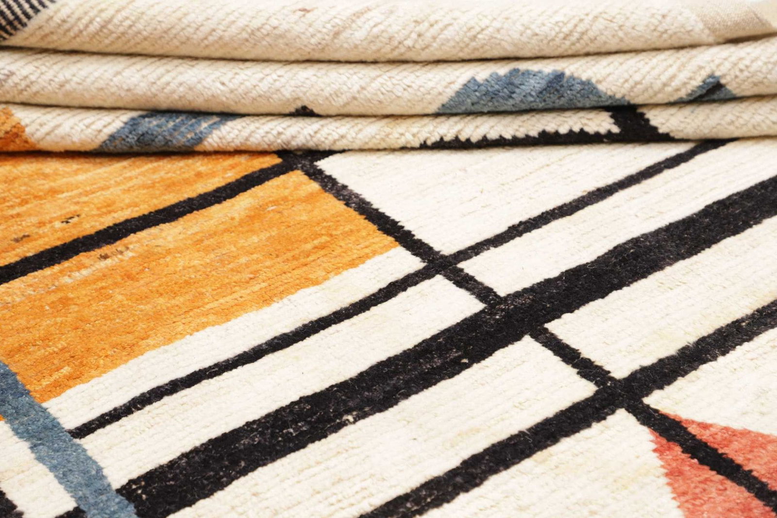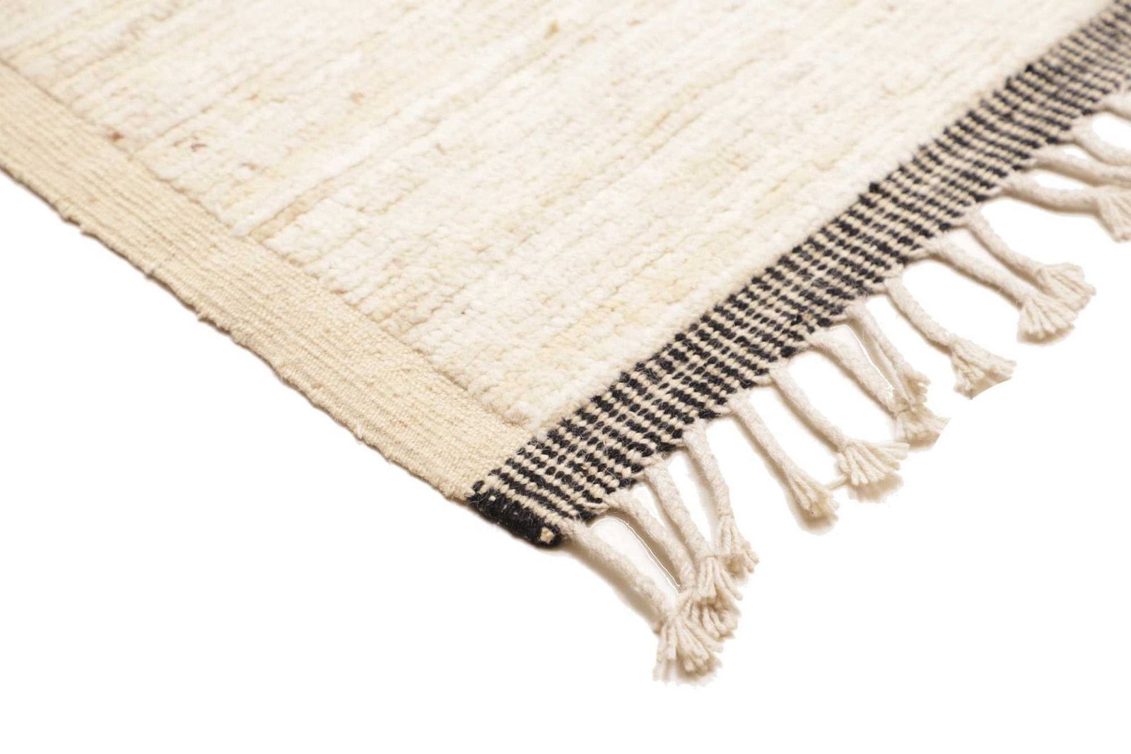 Der Berber Teppich ist handgeknüpft und weist einen Flor aus 100% Schurwolle auf. Die Kette besteht ebenfalls aus 100% Baumwolle, was für eine strapazierfähige und feine Struktur sorgt. Mit einer Knotendichte von etwa 100.000 Knoten pro Quadratmeter und einer Florhöhe von 12-15 mm bietet dieser Teppich eine angenehme Haptik und eine hohe Qualität in der Verarbeitung.