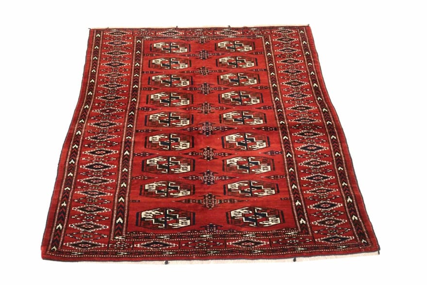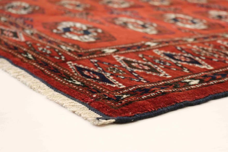 Traditioneller Buchara-Teppich | Knotendichte: 160.000 – 200.000 Knoten/m² | Material: 100 % Handgesponnene Wolle | Größe: 162×110 cm | Zustand: Antik | Herkunft: Handgefertigt in Iran/Persien | Farbe: Rot/Orange | Form: Rechteckig | Dicke: ca. 6 mm | Gewicht: ca. 4 kg