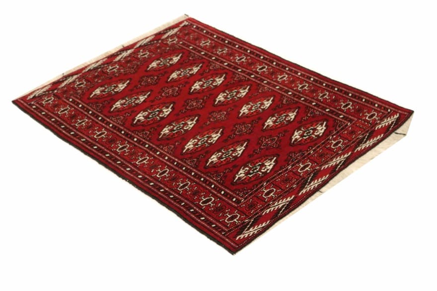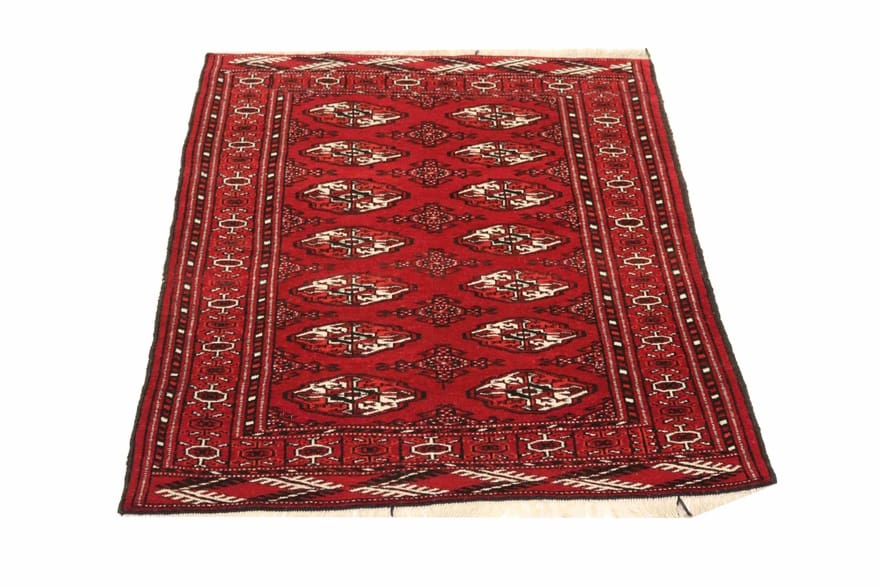 Handgefertigter Buchara Teppich | Knotendichte: 200.000 – 250.000 Knoten/m² | Material: 100 % natürliche Wolle | Größe: 142×106 cm | Farbe: Rot/Orange | Zustand: Neuzeitlich (0-20 Jahre) | Herkunft: Iran/Persien | Pflege: Regelmäßiges Staubsaugen, professionelle Reinigung empfohlen