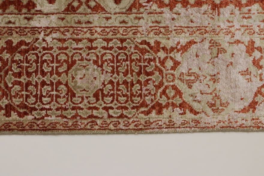 Designer-Teppich | Knotendichte: 160.000 – 200.000 Knoten/m² | Material: Wolle mit Bamboo Seide | Größe: 242×173 cm | In neuem Zustand | Herkunft: Indien | Gewicht: ca. 12 kg | Farbe: Rot/Orange | Form: Rechteckig | Dicke: ca. 18 mm | Verarbeitung: Handgeknüpft