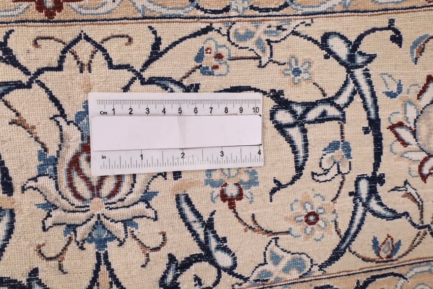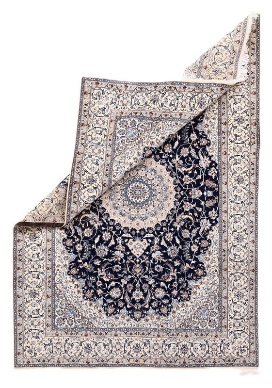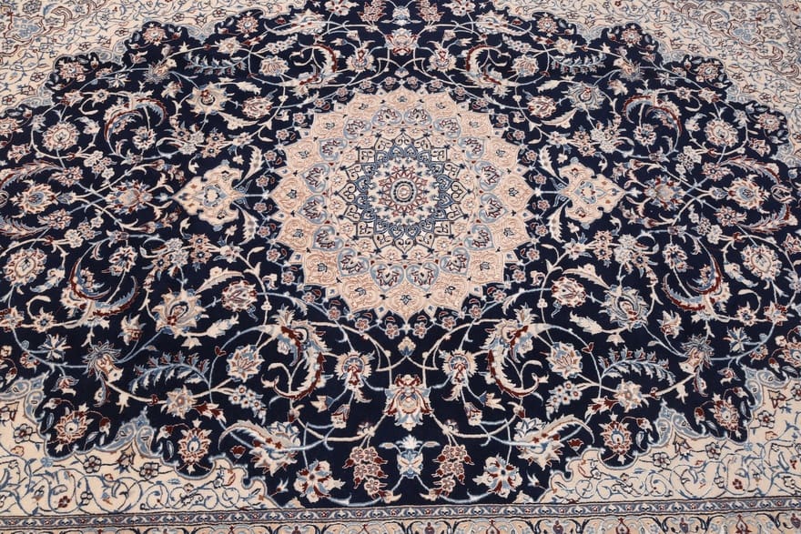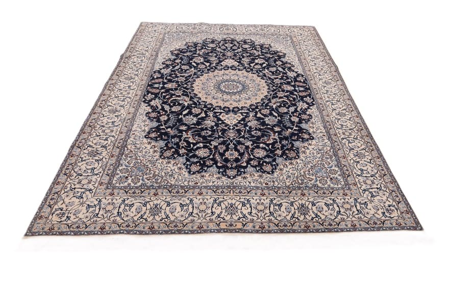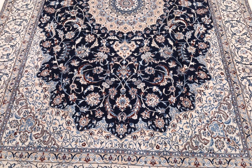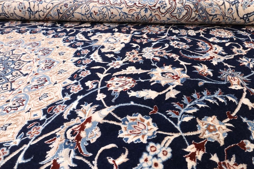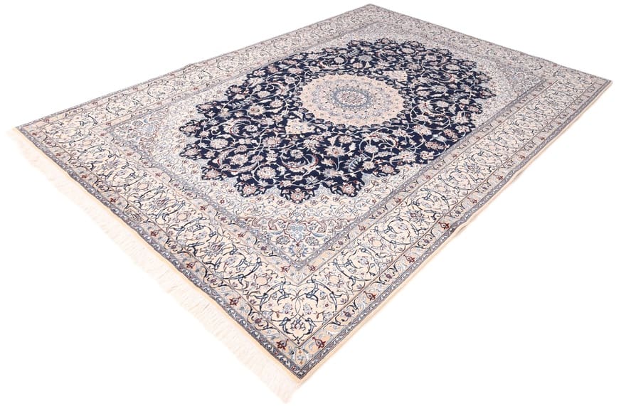 Dunkelblauer Nain 6La Teppich | Knotendichte: 850.000 – 1.000.000 Knoten/m² | Material: Wolle und Seide | Größe: 299×207 cm | Zustand: Neu | Ursprung: Iran / Persien | Florhöhe: ca. 6 mm | Gewicht: ca. 16 kg | Form: Rechteckig