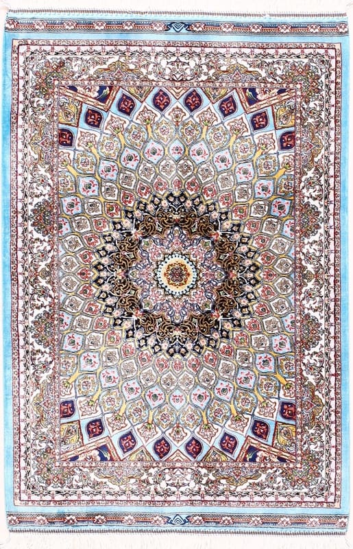 Das Design dieses edlen Ghom Teppichs ist von traditionellen Mustern inspiriert, die harmonisch in den Blau- und Türkistönen ineinanderfließen. Solche Farbnuancen sind nicht nur modern und stilvoll, sondern sie schaffen auch eine beruhigende Atmosphäre. Im Zentrum des Teppichs finden sich aufwendige florale Motive, die oft in symmetrischen Mustern angeordnet sind. Diese Kombination aus Farben und Mustern macht den Teppich zu einem echten Hingucker in jedem Raum. Solche Designs sind charakteristisch für die Bildsprache der Persianer und spiegeln deren ästhetisches Empfinden wider.
