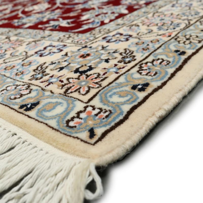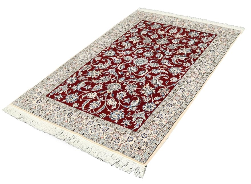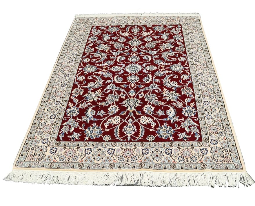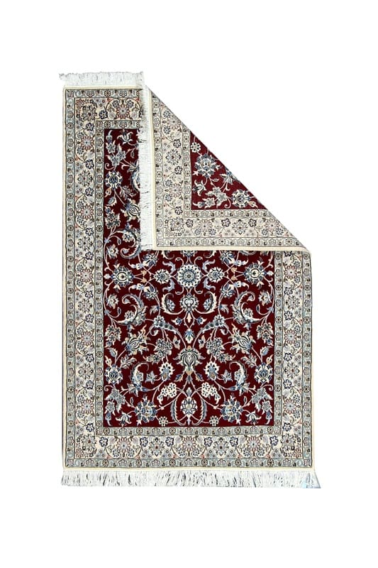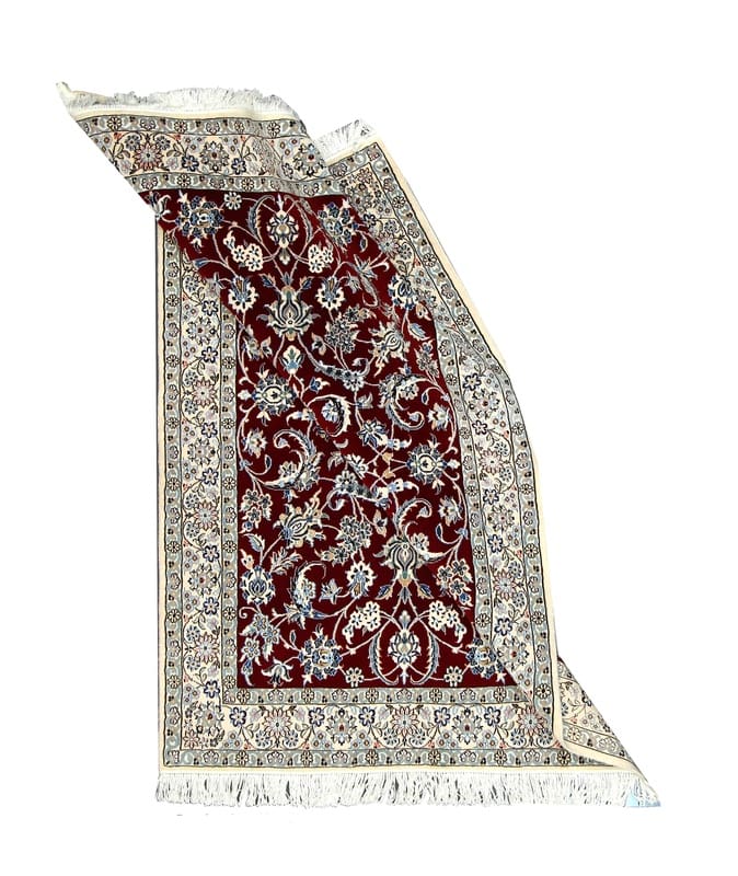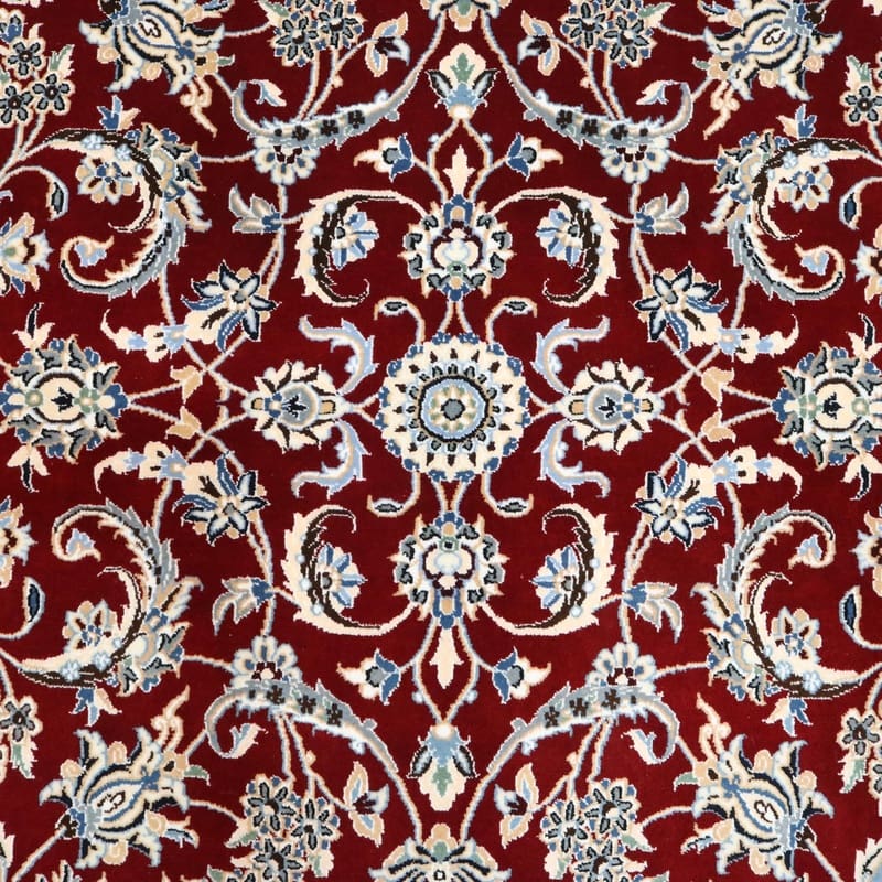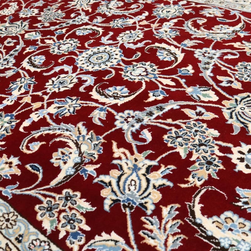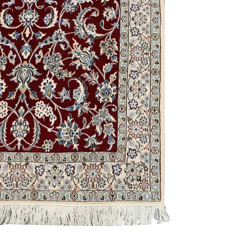 Handgewebter Nain 9 La Teppich | Knotendichte: 440.000 – 490.000 Knoten/m² | Material: Wolle und Seide | Größe: 205×136 cm | Farbe: Edles Burgunderrot mit zarten Blumenmustern | Zustand: Neu | Ursprung: Iran / Persien | Form: Rechteckig | Gewicht: ca. 8 kg | Pflegeleicht: Regelmäßiges Staubsaugen genügt