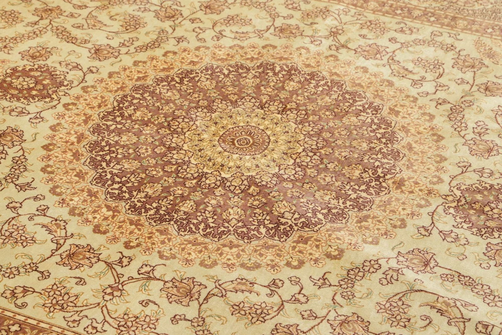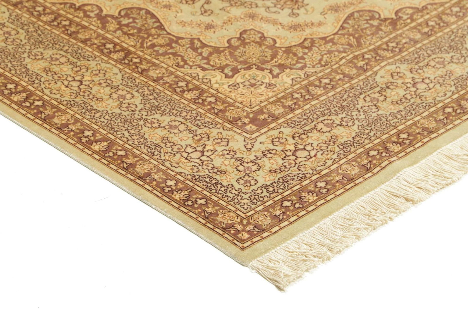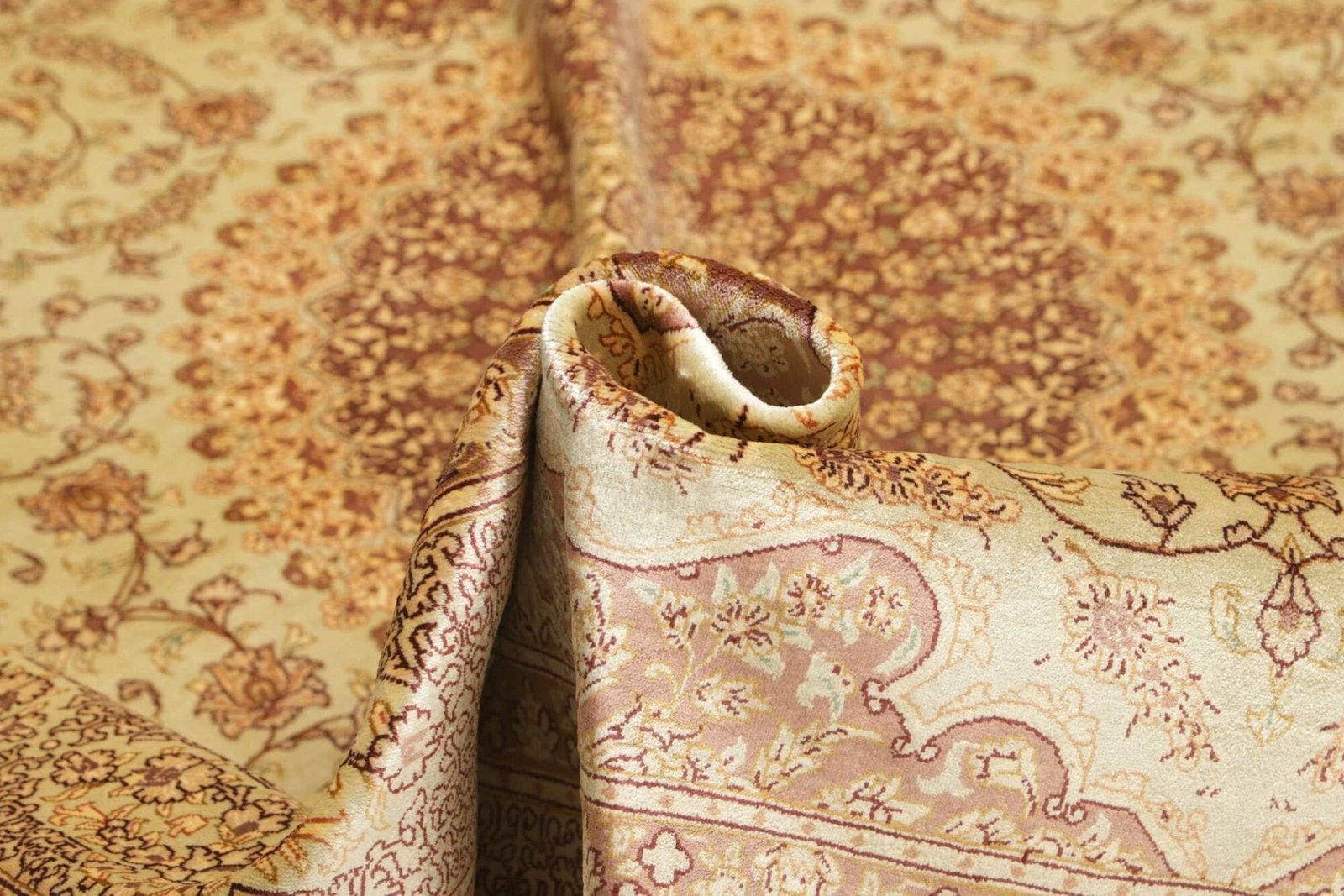 Ein besonderer Vorteil des Ghom Teppichs aus Seide ist seine Langlebigkeit und Pflegeleichtigkeit. Im Vergleich zu anderen Materialien bietet Seide einen hohen Widerstand gegen Flecken und Abnutzung. Zudem lässt sich der Teppich leicht reinigen und behält selbst nach vielen Jahren seinen Glanz. Durch seine Vielseitigkeit lässt sich dieser Teppich sowohl in klassischen als auch in modernen Wohnstilen perfekt integrieren und wertet jeden Raum auf.