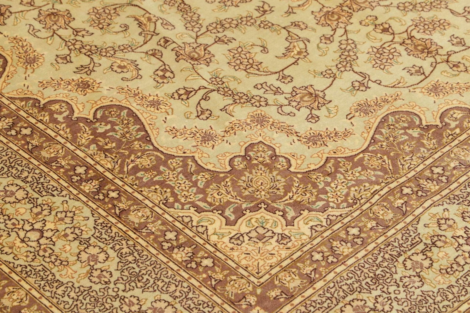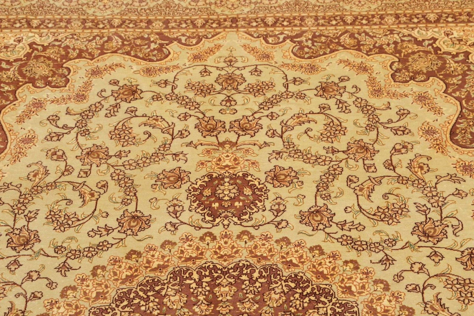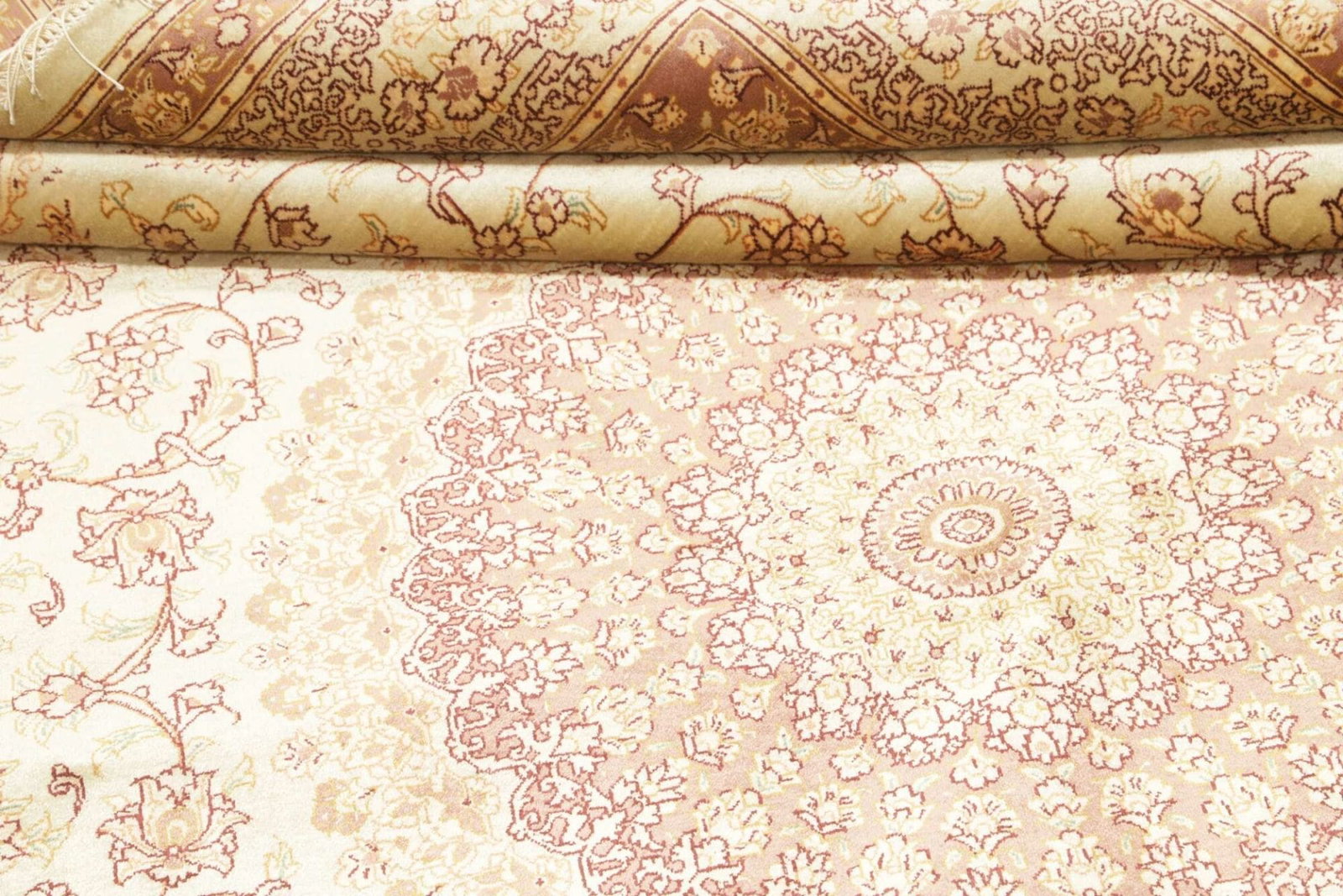 Ein besonderer Vorteil des Ghom Teppichs aus Seide ist seine Langlebigkeit und Pflegeleichtigkeit. Im Vergleich zu anderen Materialien bietet Seide einen hohen Widerstand gegen Flecken und Abnutzung. Zudem lässt sich der Teppich leicht reinigen und behält selbst nach vielen Jahren seinen Glanz. Durch seine Vielseitigkeit lässt sich dieser Teppich sowohl in klassischen als auch in modernen Wohnstilen perfekt integrieren und wertet jeden Raum auf.