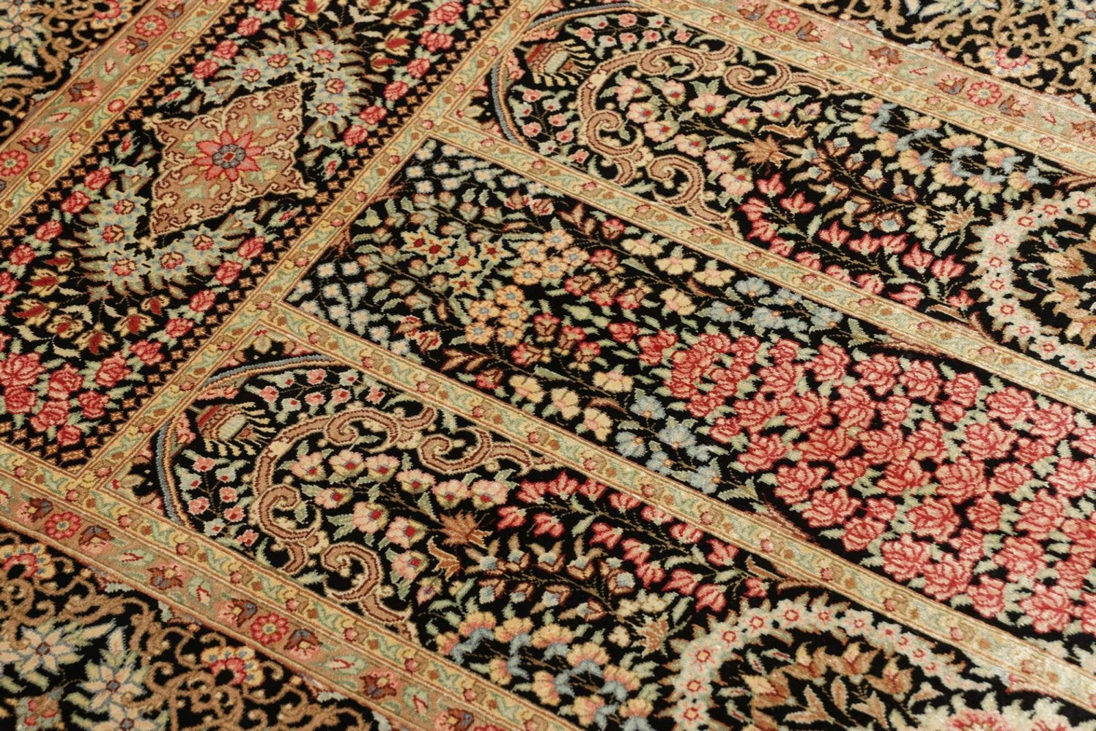 Die Verwendung von Seide als Hauptmaterial verleiht diesem Ghom Teppich eine außergewöhnliche weiche Haptik und einen unvergleichlichen Glanz. Seide hat die Fähigkeit, Licht auf eine besondere Weise zu reflektieren, sodass die Farben des Teppichs in unterschiedlichen Winkeln variieren und lebendig wirken. Dies verstärkt die visuelle Tiefe der Muster und Designs, die auf dem Teppich zu finden sind.