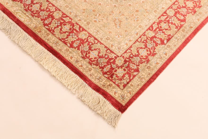 Handgeknüpfter Ghomsilk Teppich | Knotendichte: 640.000 Knoten/m² | Material: Reine Naturseide und Wolle | Größe: 152×101 cm | Farbe: Creme, Gold, Rot | Zustand: Neuzeitlich (0-20 Jahre) | Ursprung: Iran/Persien | Ideal für Gästezimmer oder luxuriöse Wohnräume