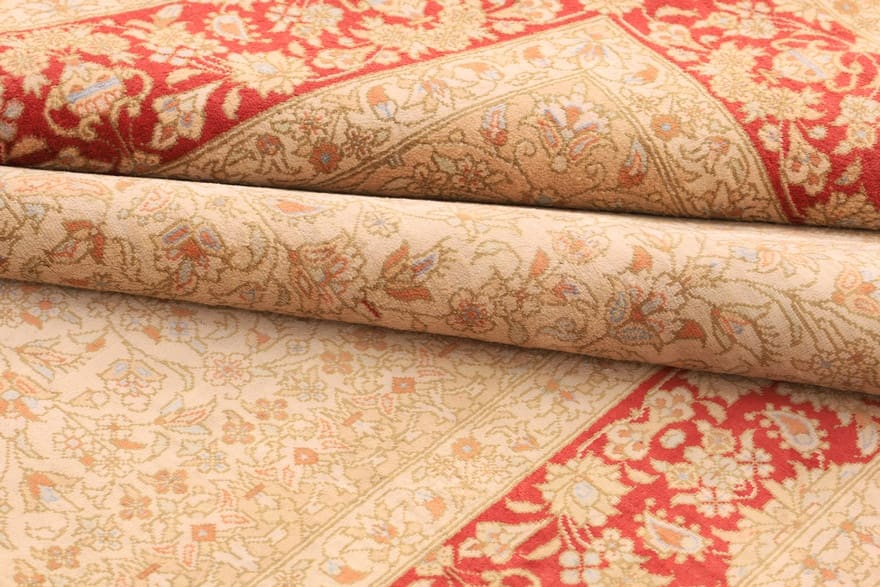 Der elegante Ghomsilk Teppich vereint meisterhaft Kunsthandwerk und Tradition. Handgeknüpft aus hochwertigem Seidenmaterial, besticht dieser Teppich durch seine gemeinsamen Elemente von zeitloser Eleganz und moderner Anmut. Das luxuriöse creme-rote Farbschema sorgt für eine harmonische und einladende Atmosphäre in jedem Raum. Der Teppich ist nicht nur ein dekoratives Element, sondern auch ein Ausdruck von Stil und Wertbeständigkeit.