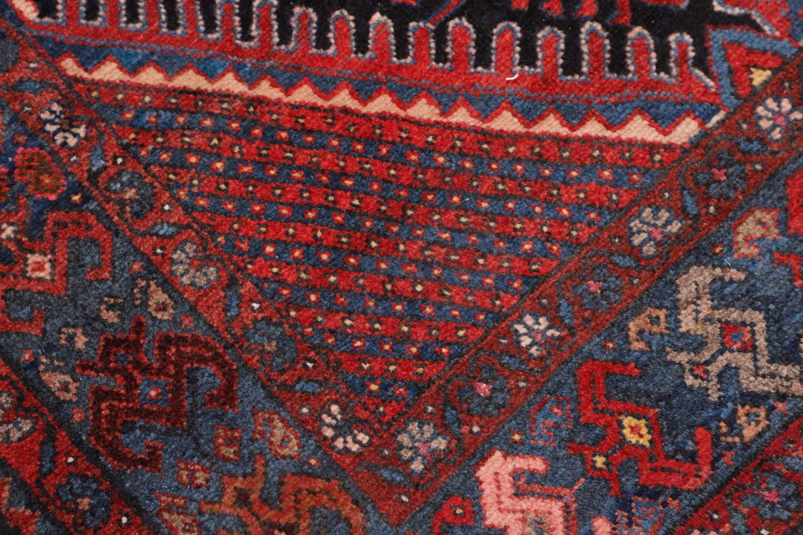 Der Hamadan Teppich mit seinem Herati-Muster ist sowohl ästhetisch ansprechend als auch funktional. Die harmonische Farbgestaltung, die verschiedene Rottöne, Creme und Blau umfasst, macht ihn zu einem vielseitigen Stück, das sich hervorragend in unterschiedliche Einrichtungsstile integrieren lässt, sei es modern, rustikal oder traditionell.