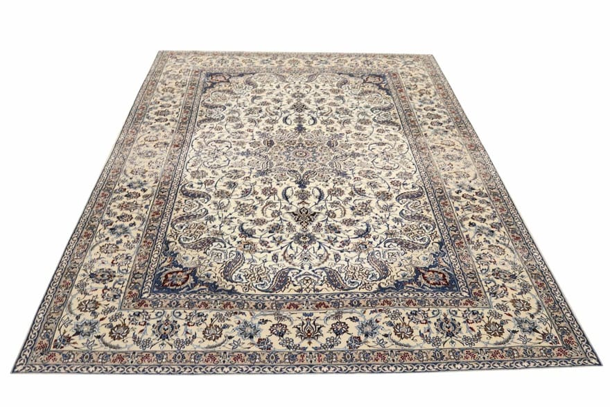 Eleganter NAIN 9 LA Teppich | Knotendichte: 200.000 – 250.000 Knoten/m² | Material: Hochwertige Wolle | Größe: 334×221 cm | Farbe: Weiß/Beige | Zustand: Neu | Ursprung: Iran/Persien | Verarbeitung: Handgeknüpft