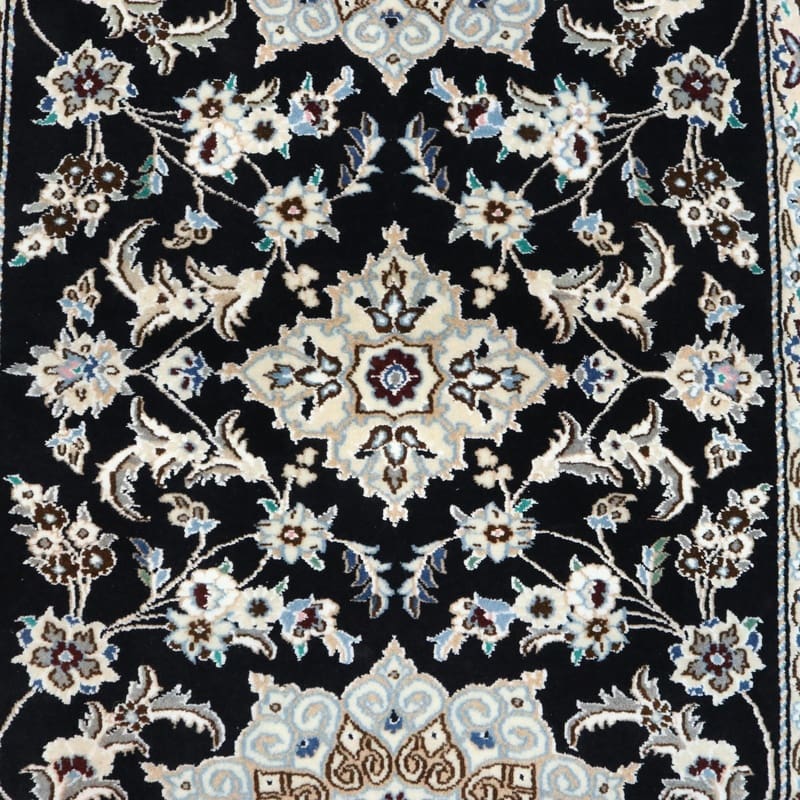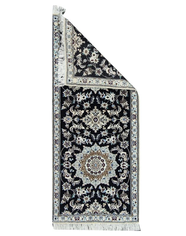 Eleganter Nain 9 La Teppich | Knotendichte: 440.000 – 490.000 Knoten/m² | Material: Wolle und Seide | Größe: 196×82 cm | Farbe: Dunkelblau mit feinen Mustern | Ursprung: Iran/Persien | Zustand: Neu | Verarbeitung: Handgeknüpft | Dicke: ca. 8 mm | Gewicht: ca. 7 kg