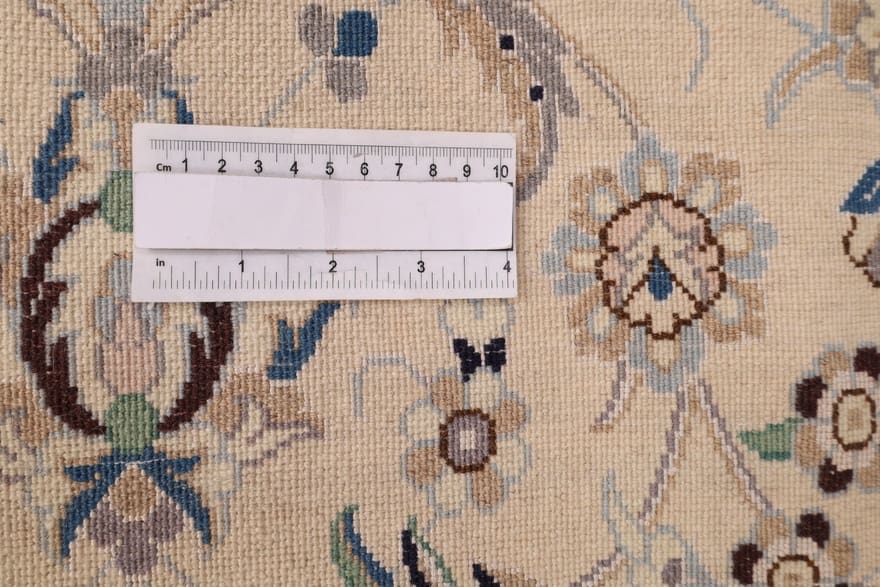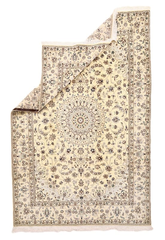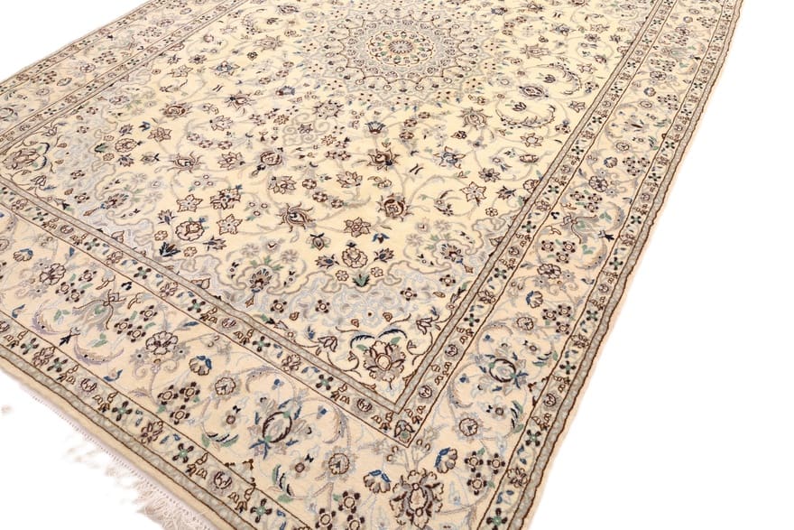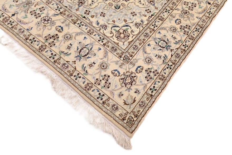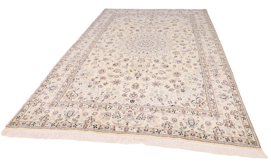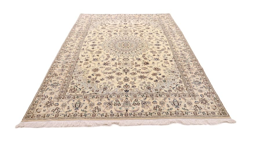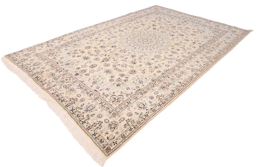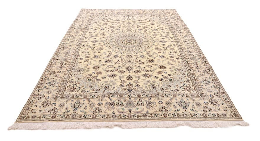 Eleganter Nain 9La Teppich | Knotendichte: 440.000 – 490.000 Knoten/m² | Material: Hochwertige Wolle und Seide | Größe: 325×213 cm | Farbe: Creme/Beige | Zustand: Antik | Ursprung: Iran/Persien | Verarbeitung: Handgeknüpft | Florhöhe: ca. 6 mm | Gewicht: ca. 18 kg