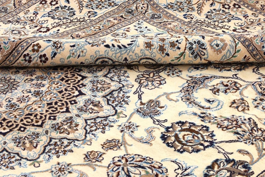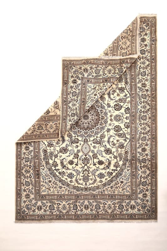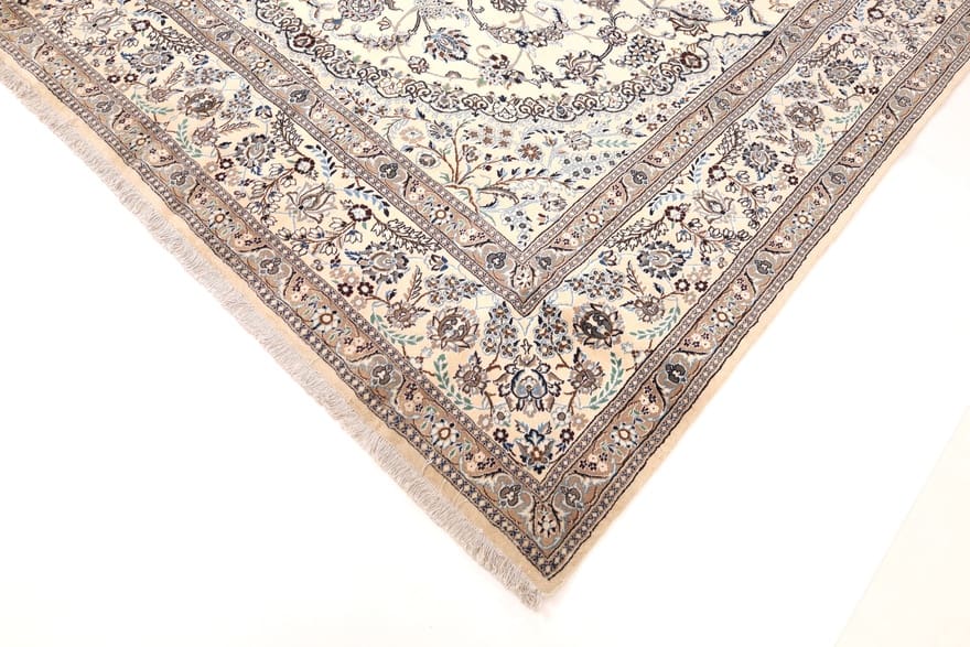 Handgewebter Nain-Teppich | Knotendichte: 200.000-250.000 Knoten/m² | Material: 100 % Wolle und Seide | Größe: 417×289 cm | Herkunft: Iran | Zustand: Neuzeitlich (0-20 Jahre) | Farbe: Weiß/Beige | Verarbeitung: Handgeknüpft | Dicke: ca. 8 mm