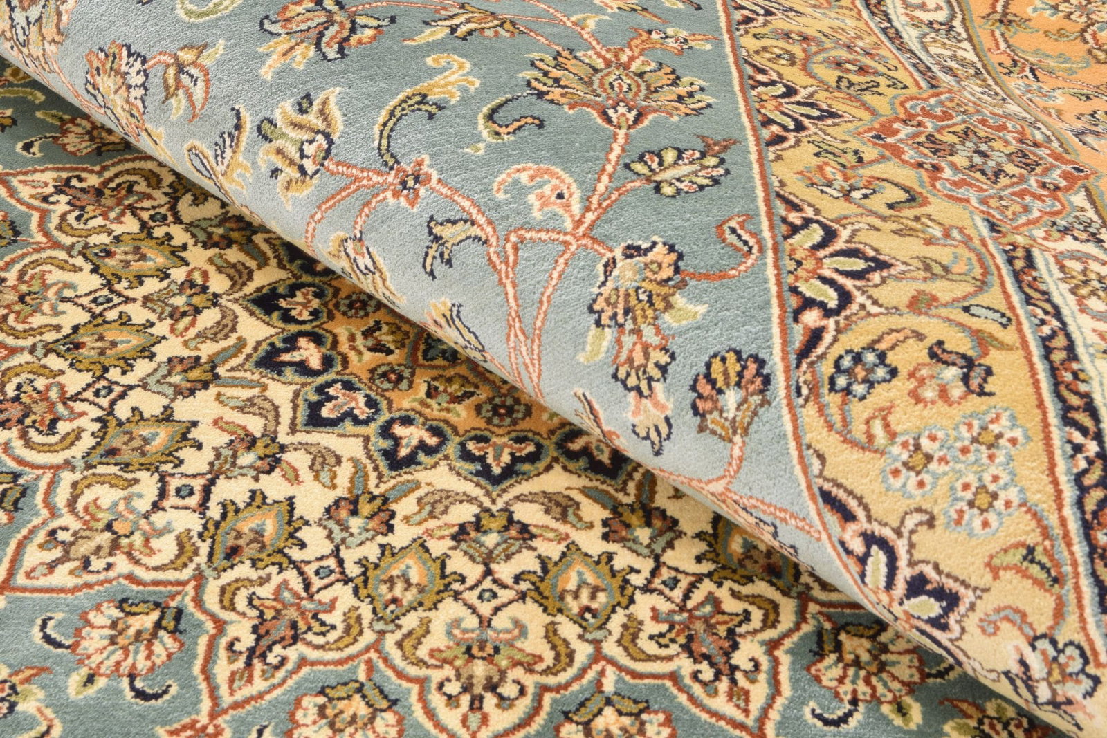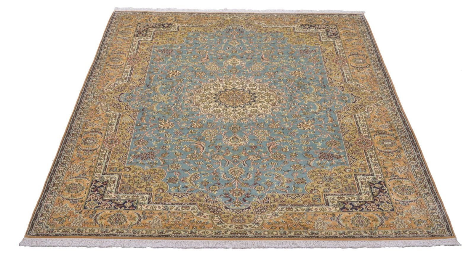 Ein Orientteppich aus Kashmirseide passt perfekt in Wohnzimmer, Schlafzimmer oder Empfangsräume. Er schafft überall eine warme und einladende Atmosphäre.