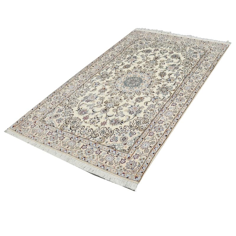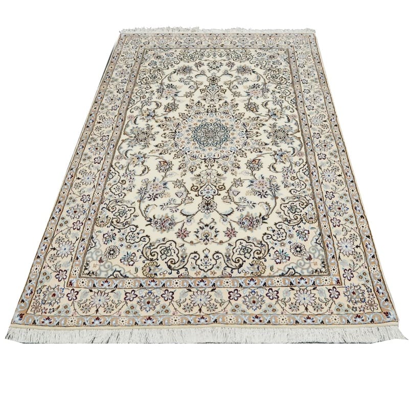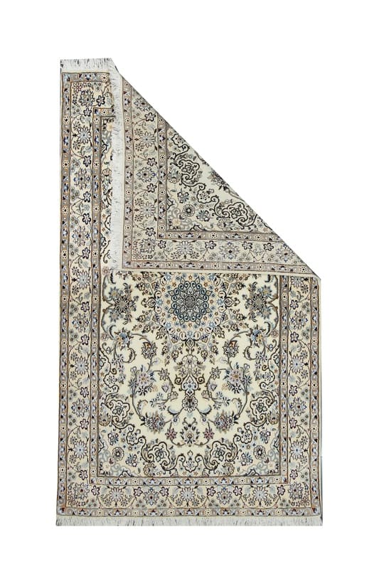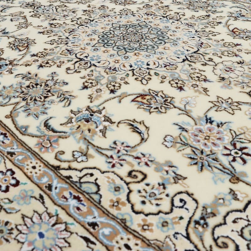Handgewebter TeppichBazar Nain 9 La Teppich | Knotendichte: 320.000 – 360.000 Knoten/m² | Material: Wolle und Seide | Größe: 216×127 cm | Farbe: Elfenbein-Blau | Zustand: Neu | Herkunft: Iran/Persien | Verarbeitung: Handgeknüpft | Dicke: ca. 8 mm | Gewicht: ca. 6 kg