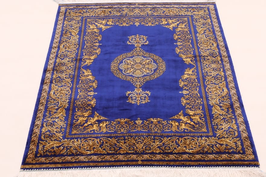 Eleganter Seidenteppich | Knotendichte: Hand- und maschinell gefertigt | Material: Hochwertige Kunstseide | Größe: 152×101 cm | Florhöhe: ca. 6 mm | Gewicht: ca. 6 kg | Farbe: Blau/Türkis | Herkunft: Iran/Persien | Zustand: Neu | Pflege: Schonendes Staubsaugen, professionelle Reinigung empfohlen