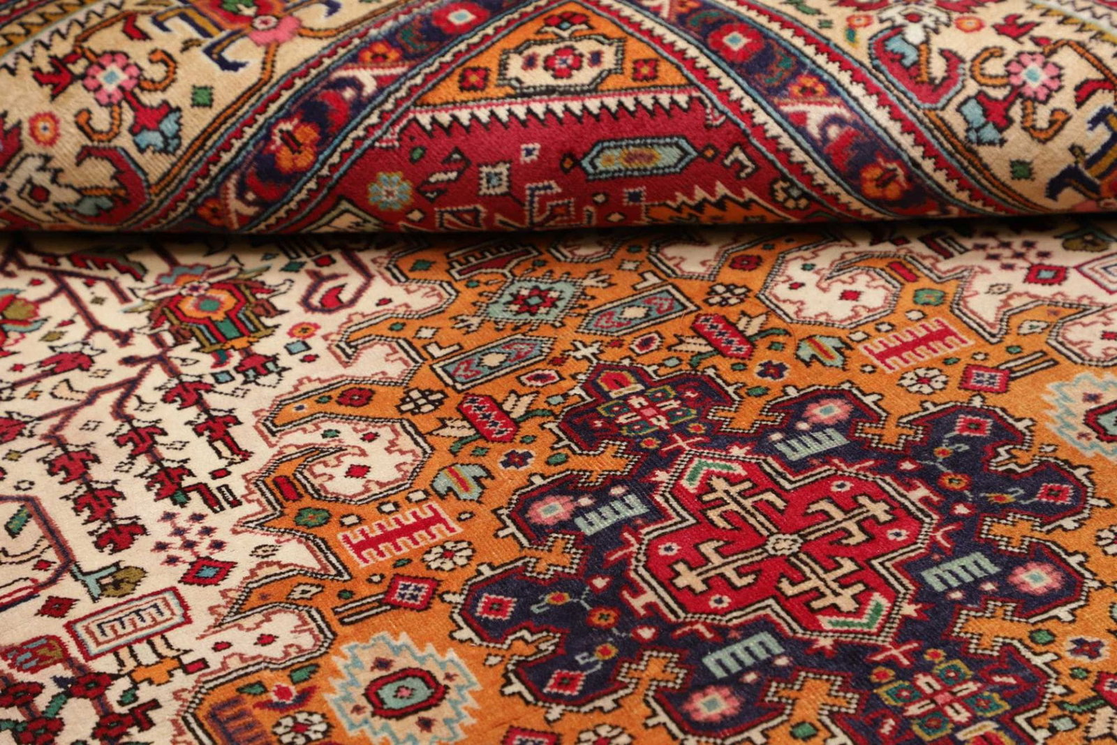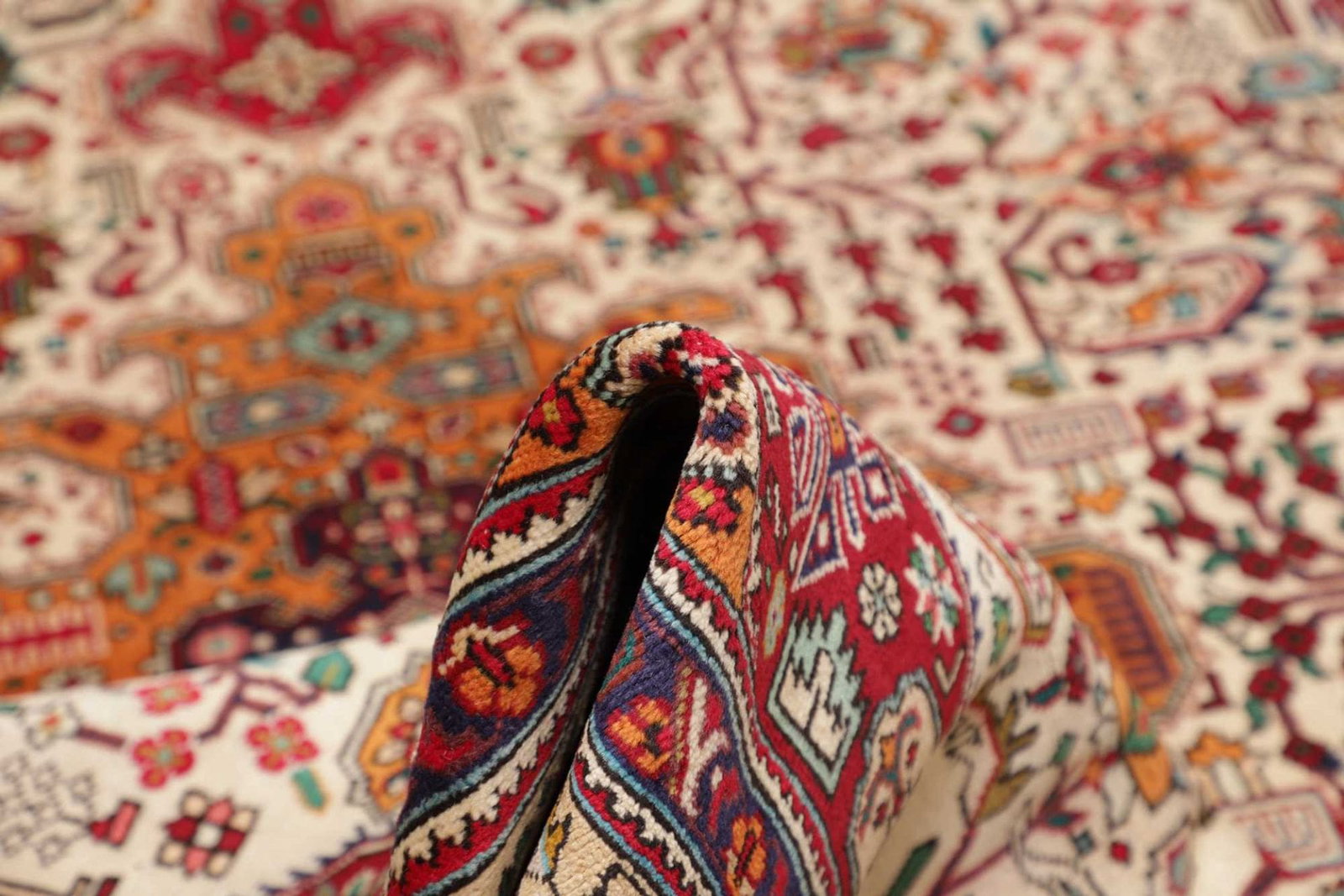 Da der Teppich handgeknüpft ist, sind kleine Unregelmäßigkeiten in den Mustern oder Farben kein Mangel, sondern zeugen von der individuellen Handarbeit, die in jedes Stück geflossen ist. Dies macht jeden Täbriz Teppich zu einem Unikat.