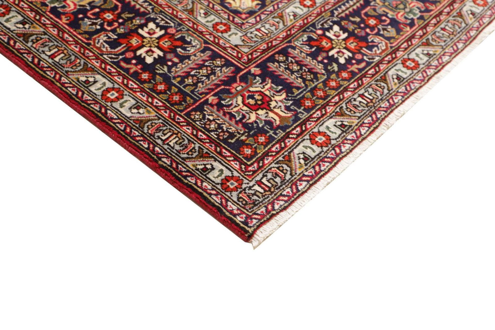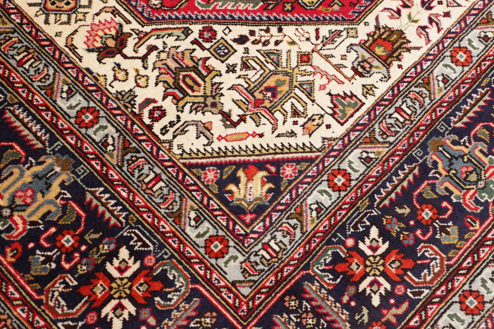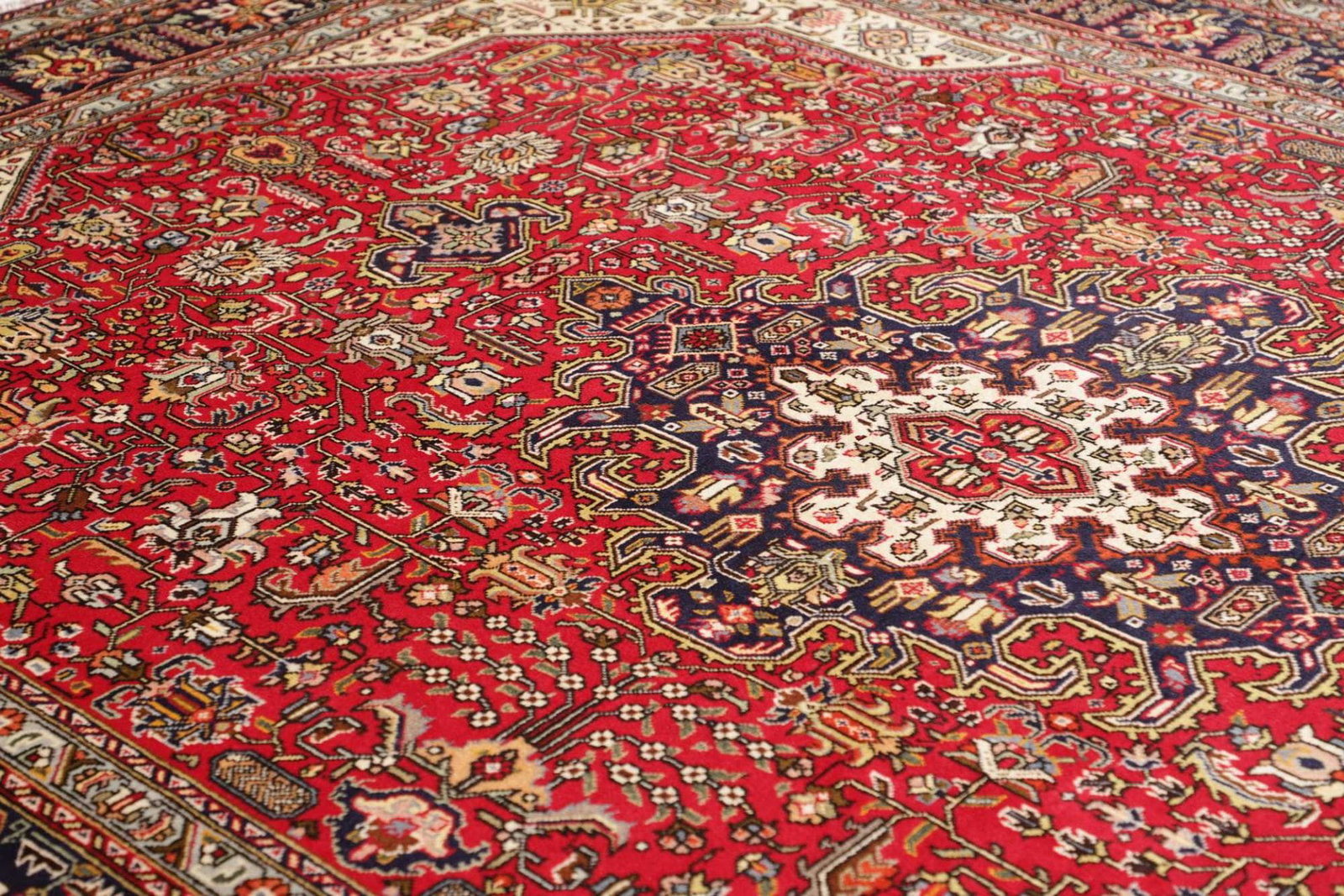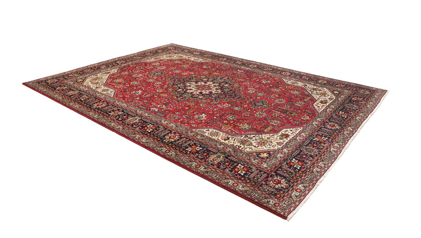 Dieser Teppich stammt aus der legendären Stadt Tabriz im Iran, einer der ältesten und bekanntesten Teppichproduktionsstätten der Welt. Tabriz hat eine lange Geschichte in der Kunst des Teppichknüpfens, die bis ins 15. Jahrhundert zurückreicht. Die Städte und Dörfer der Region sind berühmt für ihre vielfältigen Designs und hochwertigen Materialien. Die traditionsreiche Teppichkunst von Tabriz ist entscheidend für die Identität der Region und spiegelt die kulturellen Einflüsse durch Jahrhunderte hinweg wider. Bei der Anfertigung wird auf symbolische Motive geachtet, die oft Blumen, geometrische Formen oder Tiermotive darstellen und dabei Geschichten von alten Zeiten erzählen.
