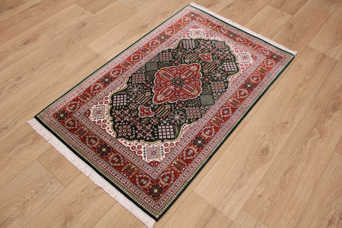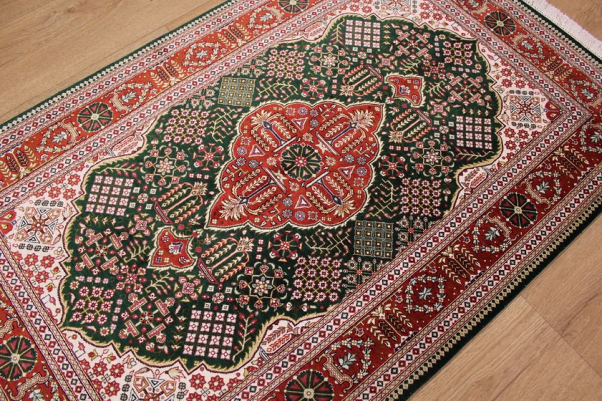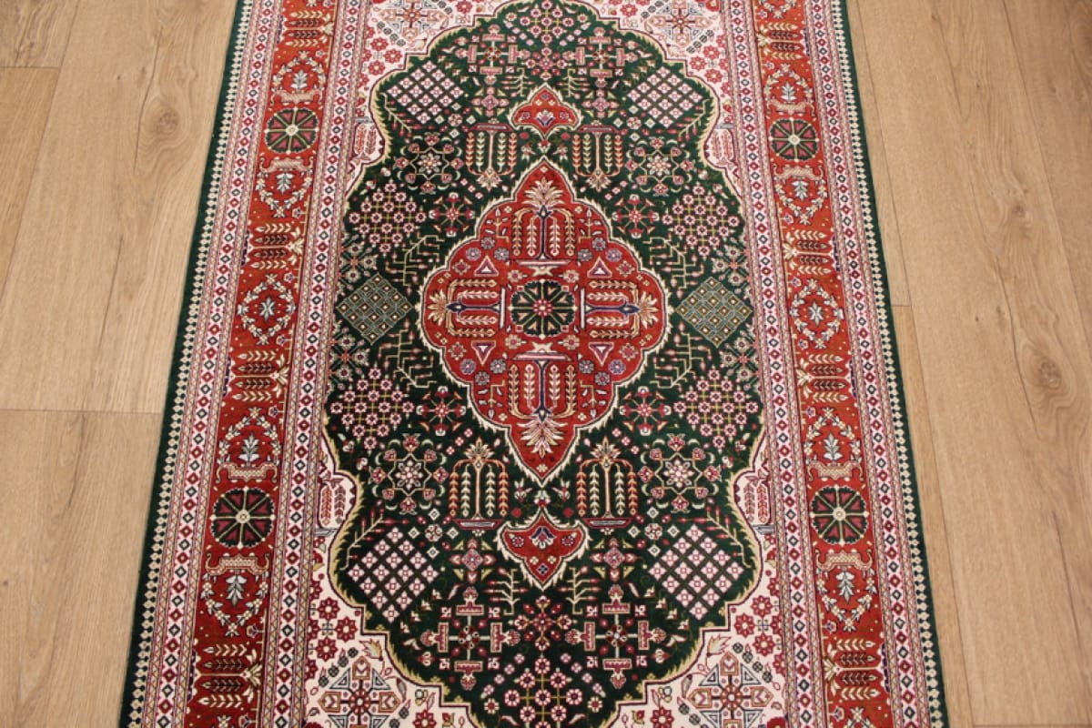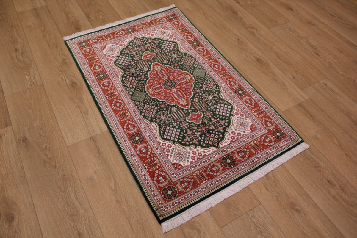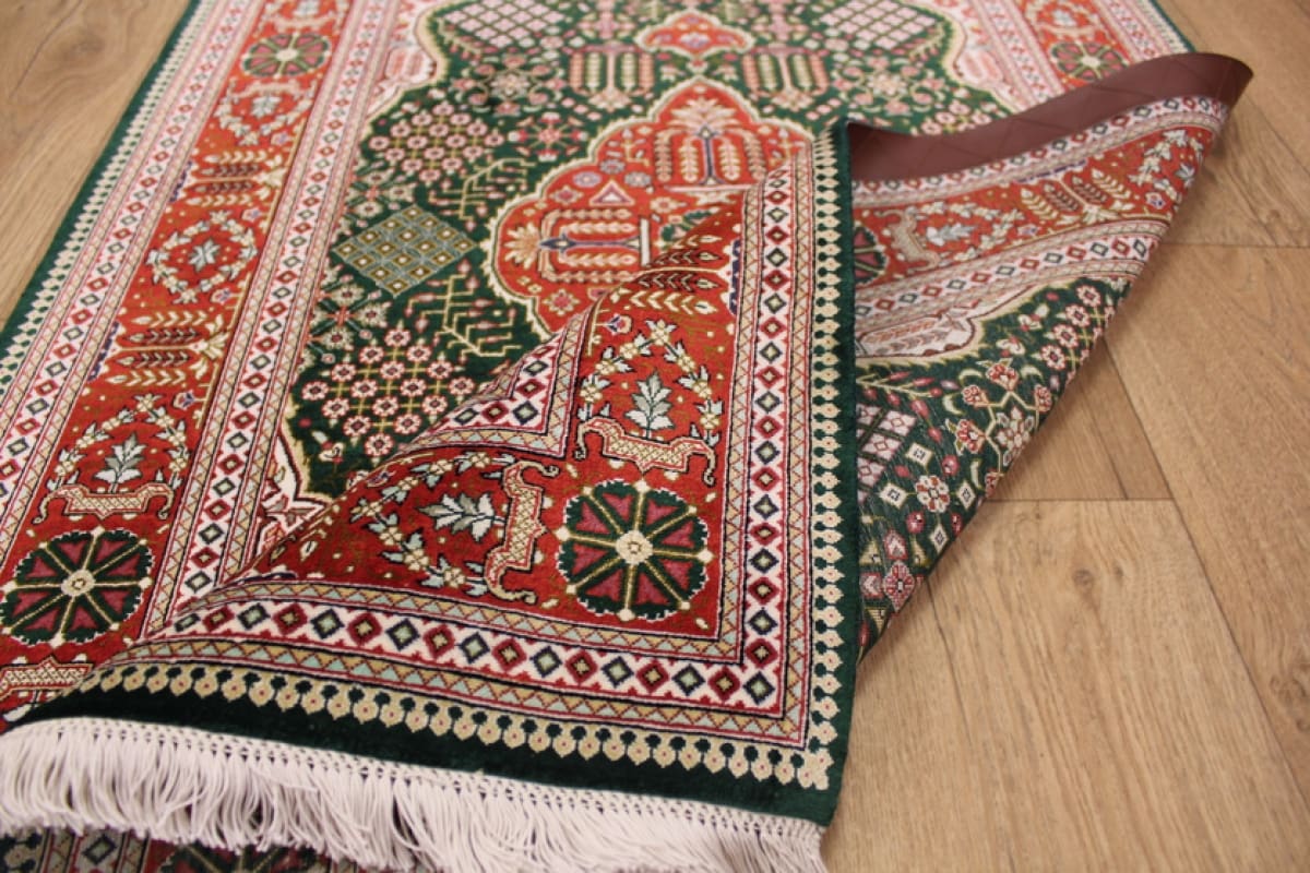 Exklusiver Ghom Seidenteppich 126×78 cm Grün, handgeknüpft