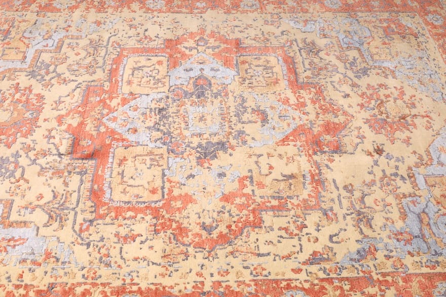 Der Teppich besteht aus 100 % Wolle und Bambusseide, was ihm eine einzigartige Weichheit und Langlebigkeit verleiht. Die Wolle sorgt für eine angenehme Haptik und hohe Strapazierfähigkeit, während die Bambusseide für einen sanften Glanz und zusätzliche Farbnuancen sorgt. Diese Kombination macht den Teppich nicht nur zu einem optischen Highlight, sondern auch zu einem robusten Alltagsbegleiter. Die hochwertige Handknüpfung garantiert dabei eine hohe Knotendichte, was die Haltbarkeit und die Exklusivität des Produkts unterstreicht.