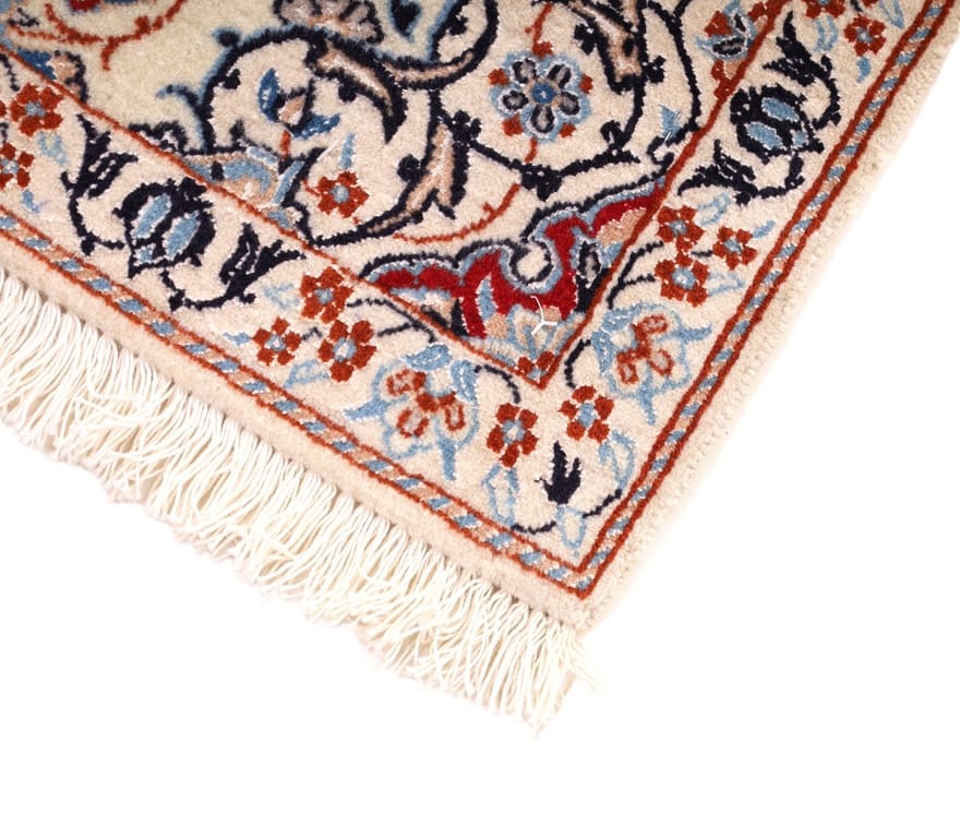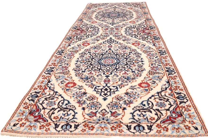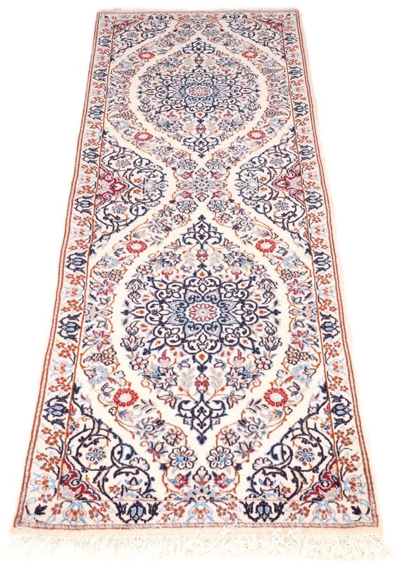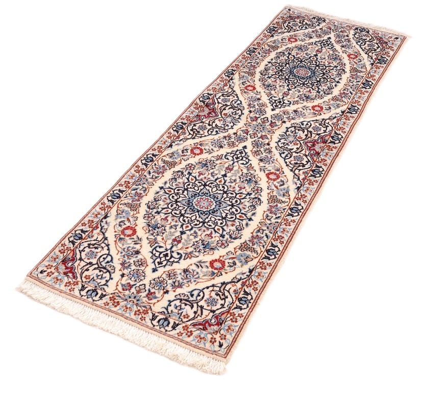 Handgeknüpfter Nain 6 La Teppich | Knotendichte: 450.000 – 500.000 Knoten/m² | Material: Wolle und Seide | Größe: 150×48 cm | Farbe: Elfenbein, Rot und Blau | Zustand: Neu | Ursprung: Iran/Persien | Verarbeitung: Handgeknüpft | Gewicht: ca. 5 kg