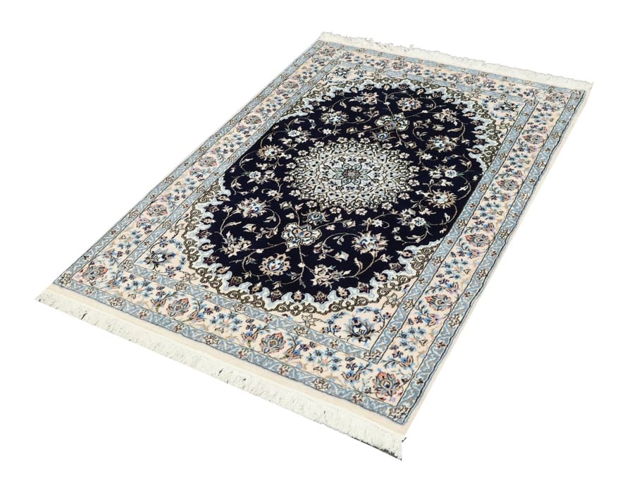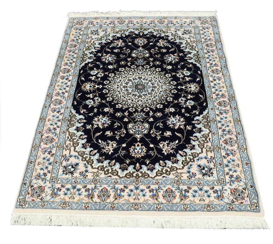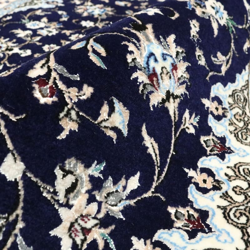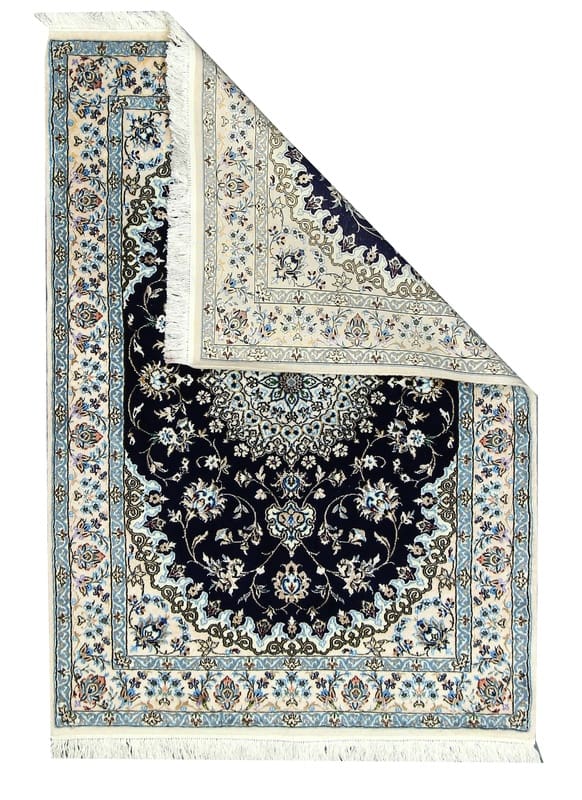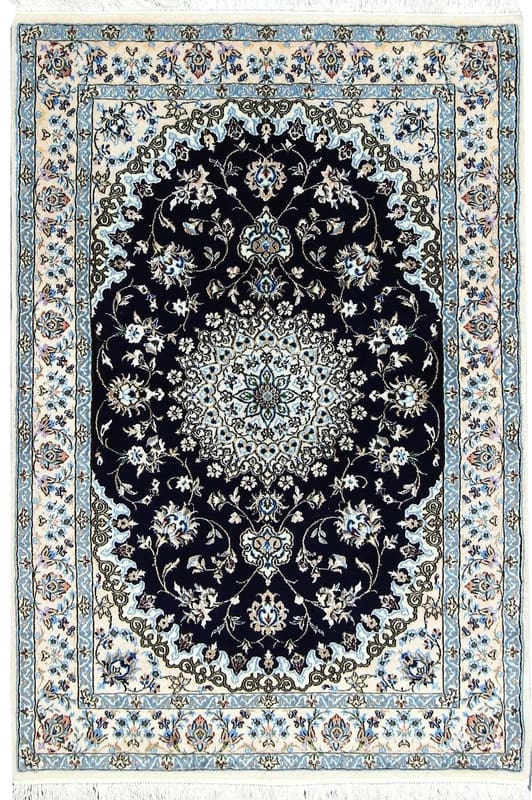 Exklusiver handgeknüpfter Nain 6La Teppich | Knotendichte: 450.000 – 500.000 Knoten/m² | Material: Hochwertige Wolle und Seide | Größe: 150×104 cm | Farbe: Tiefschwarz mit blauen und cremefarbenen Akzenten | Ursprung: Iran / Persien | Zustand: Neu | Verarbeitung: Handgetuftet | Dicke: ca. 8 mm | Gewicht: ca. 5 kg