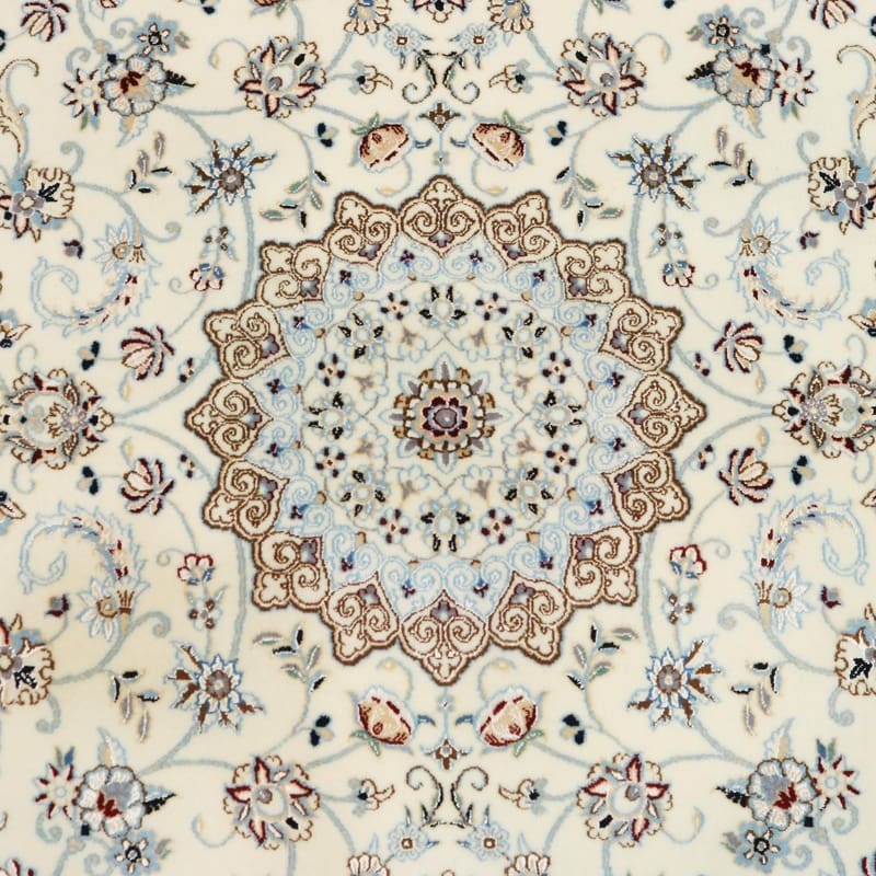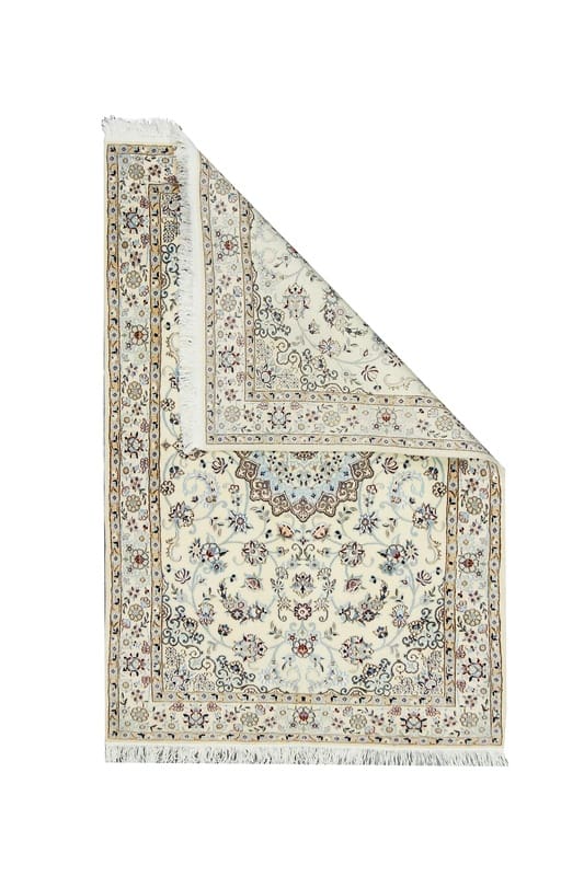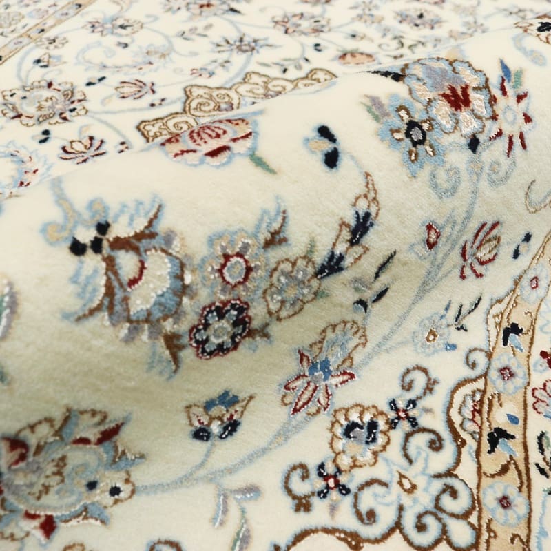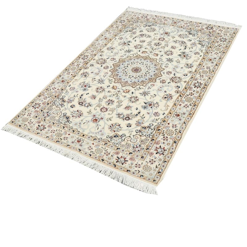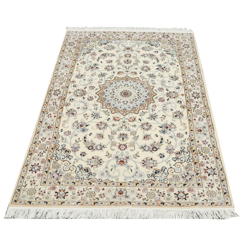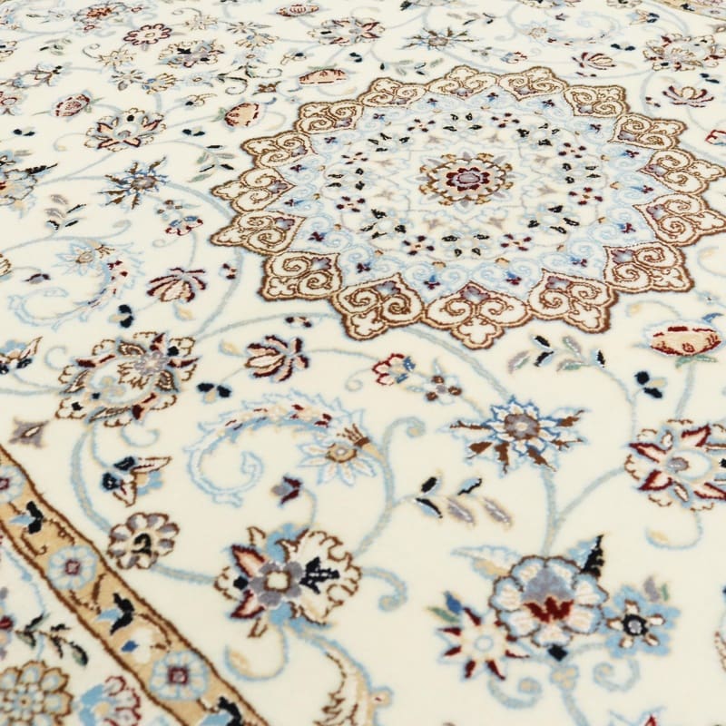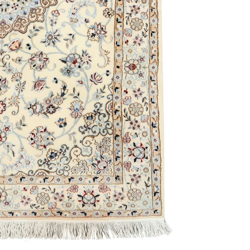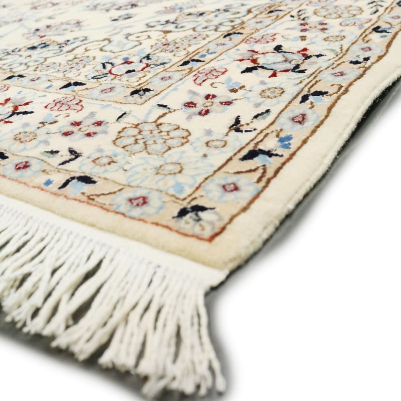 Handgeknüpfter Nain 6La Teppich | Knotendichte: 450.000 – 500.000 Knoten/m² | Material: Hochwertige Wolle und Seide | Größe: 159×107 cm | Farbe: Creme mit blauen Akzenten | Herkunft: Iran / Persien | Zustand: Neu | Florhöhe: ca. 8 mm | Gewicht: ca. 6 kg