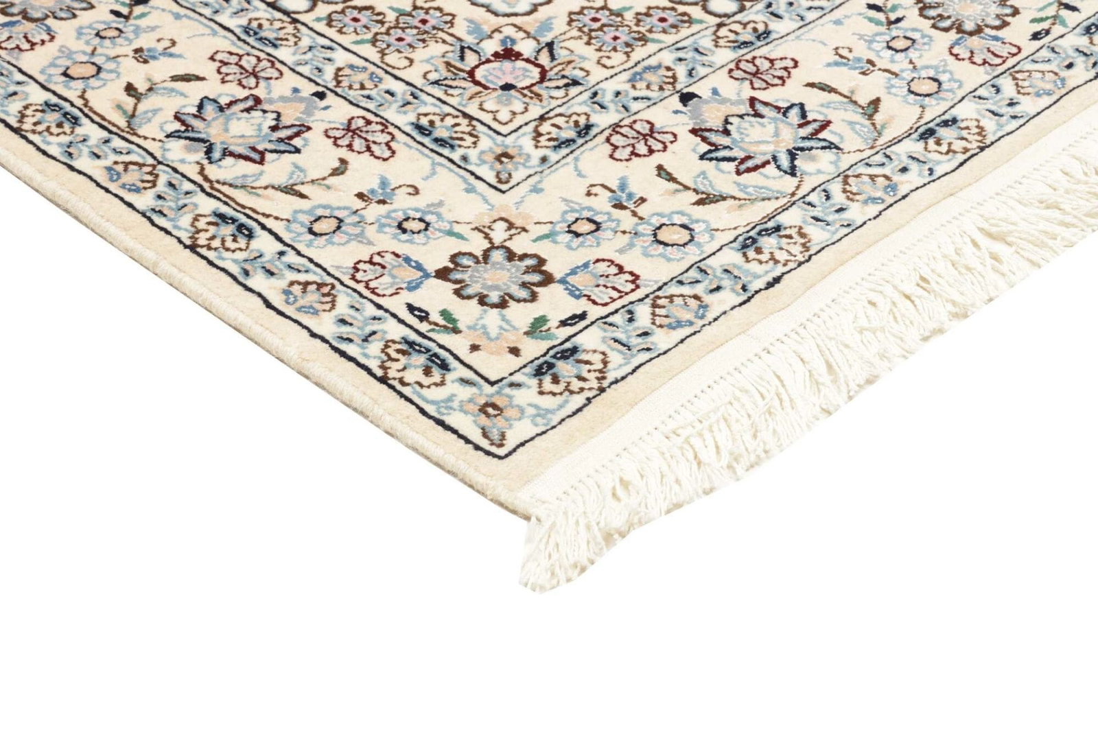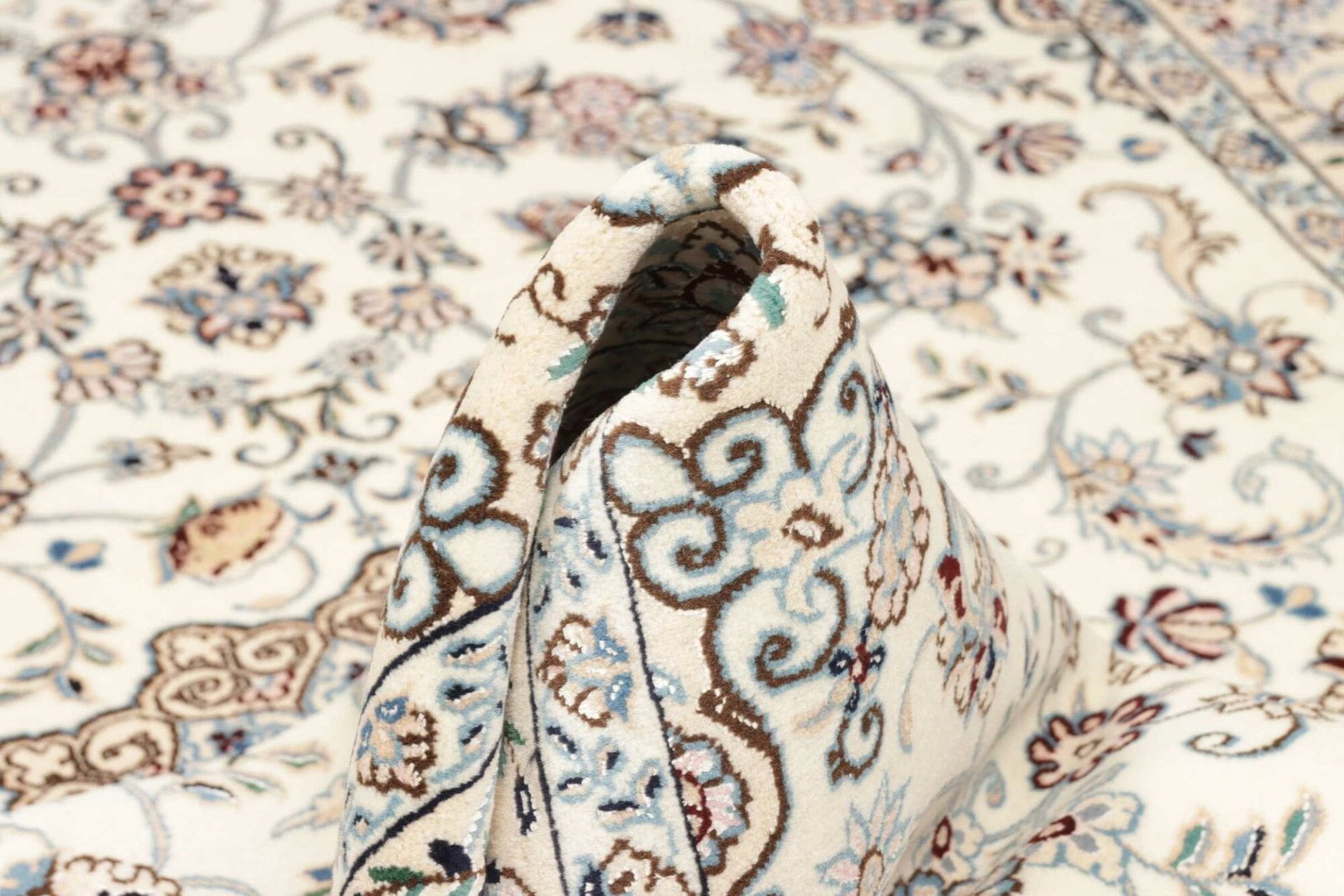 Der exklusive Nain Teppich ist ein außergewöhnliches Kunstwerk, das die Tradition der renommierten Teppichkunst des Iran repräsentiert. Als handgeknüpfter Teppich besticht er durch florale Muster, die das einzigartige Design widerspiegeln, für das Nain Teppiche weltweit bekannt sind.