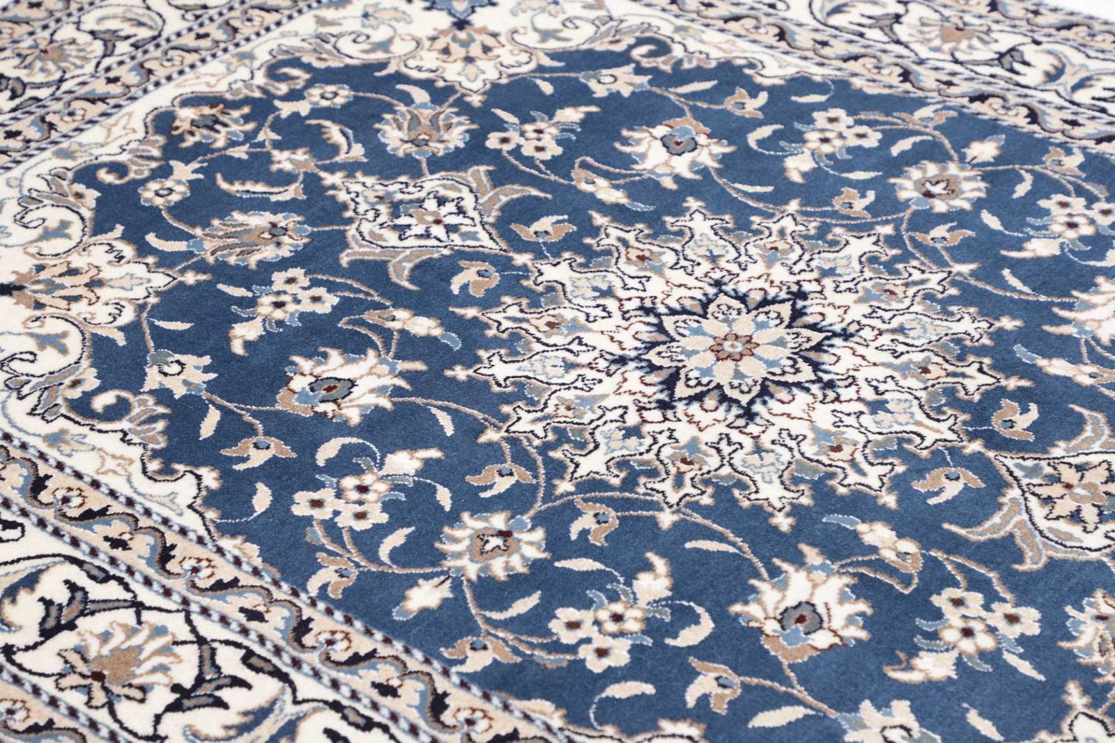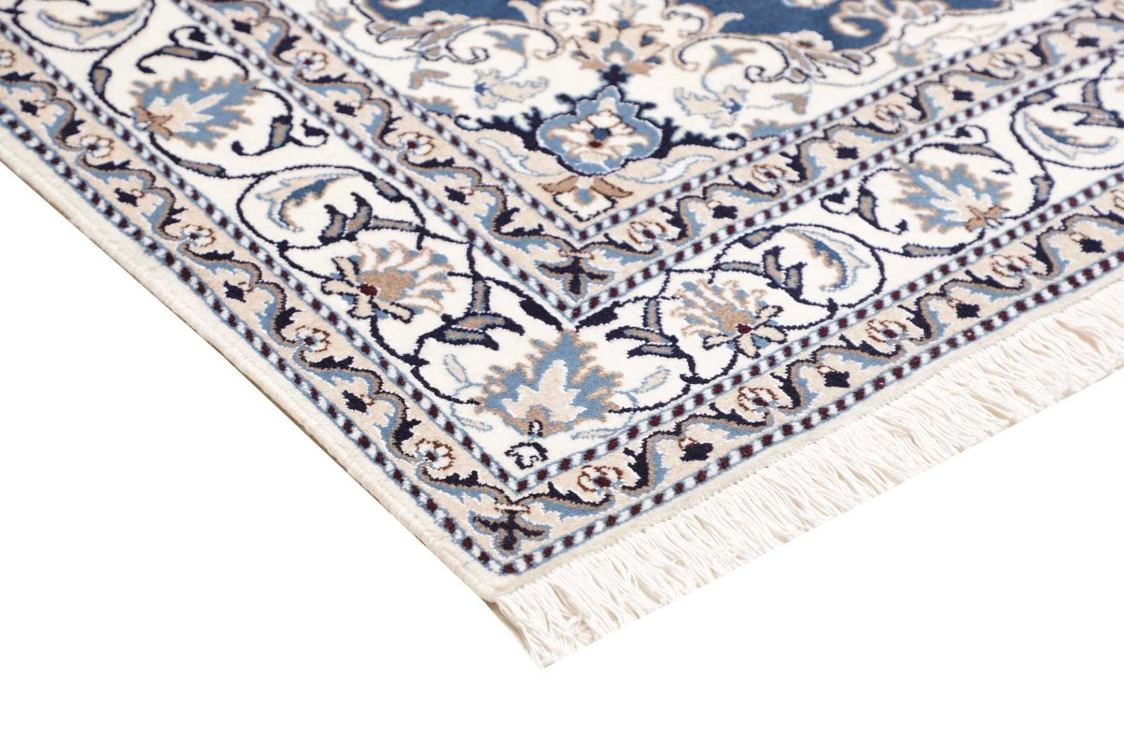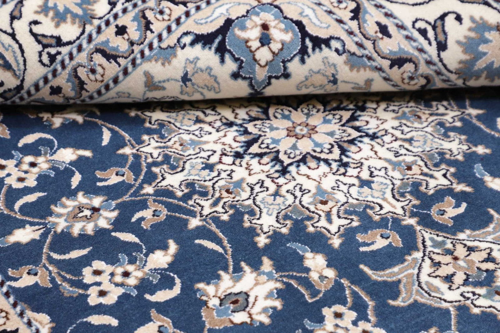 Ein typisches Merkmal der Nain Teppiche ist die Verwendung von blau- und beigetönen, die ihnen ein elegantes und edles Aussehen verleihen. Dieses zeitlose Design passt zu verschiedenen Einrichtungsstilen, von klassisch bis modern, und macht den Teppich zu einem vielseitigen Gestaltungselement.