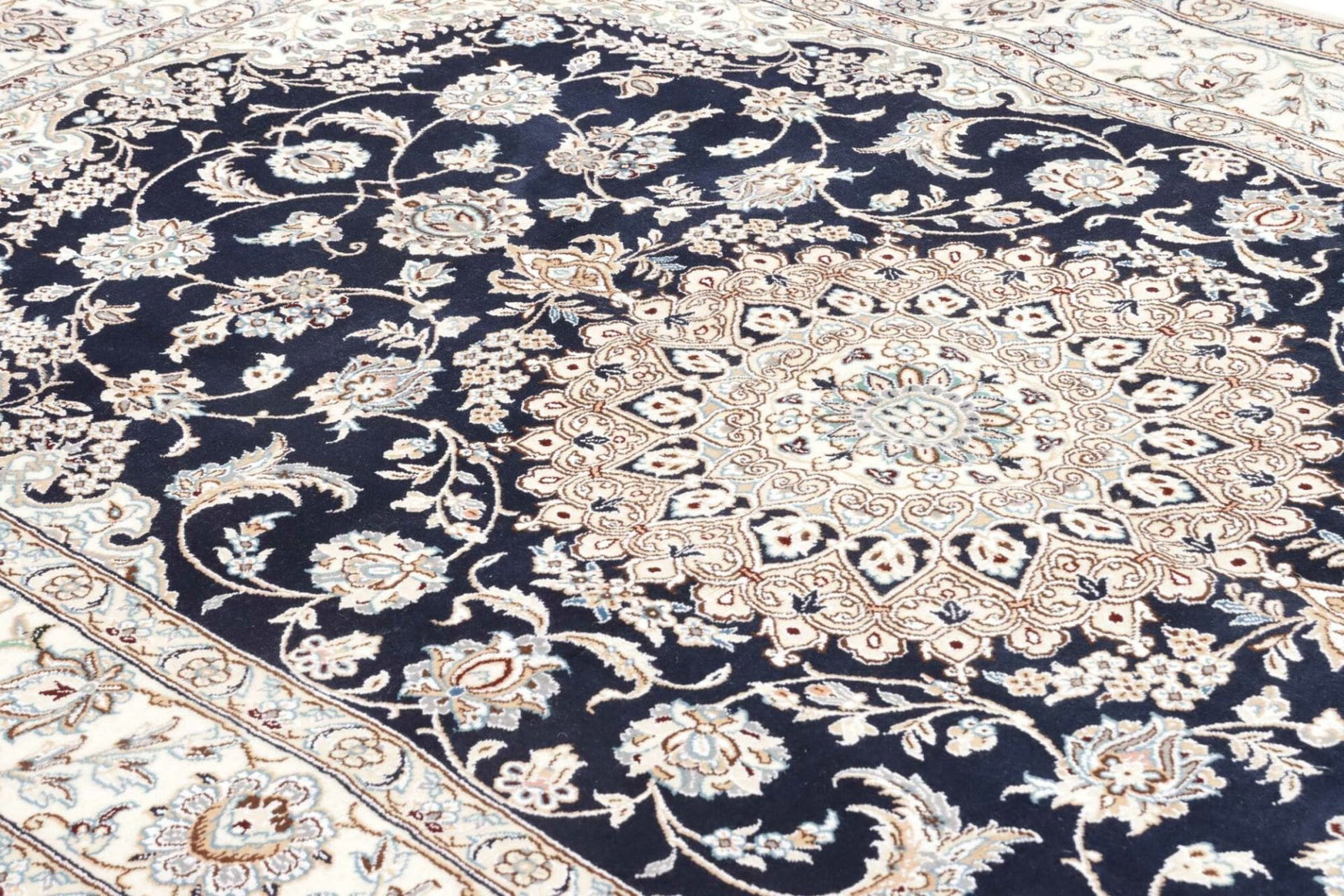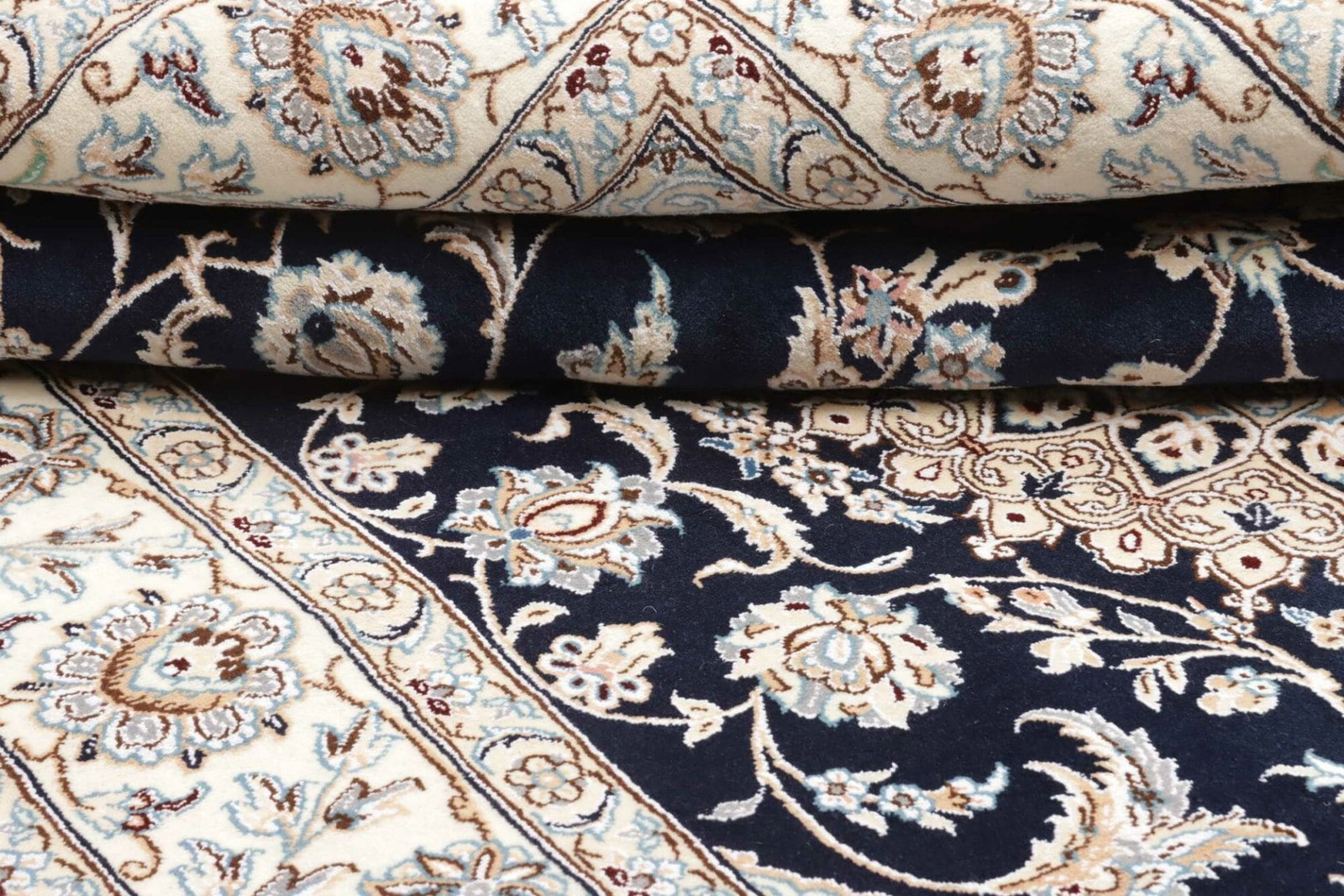 Handgeknüpfte Teppiche, wie dieser Nain Teppich, zeichnen sich durch ihre hohe Qualität, Langlebigkeit und die Einzigartigkeit jedes einzelnen Knotens aus. Im Gegensatz dazu sind maschinell hergestellte Teppiche oft weniger widerstandsfähig und sind in den Designs gleichmäßiger, aber nicht so individuell oder detailverliebt.