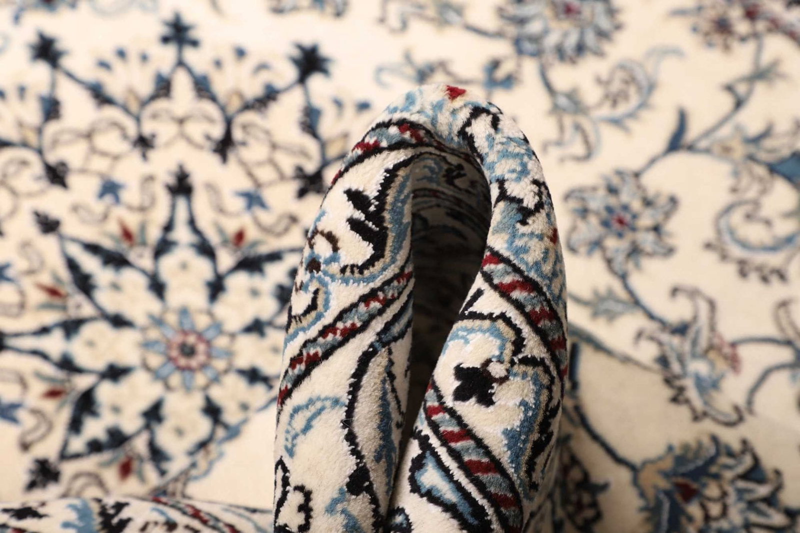 Der Nain Teppich ist aus hochwertigen Materialien gefertigt, die ihn nicht nur langlebig, sondern auch besonders angenehm machen. Die Verwendung von reiner Wolle und Seide verleiht dem Teppich seine weiche Haptik und einen subtilen Glanz. Dabei sorgt die besondere Knotentechnik für eine hohe Knotendichte, die für die Langlebigkeit des Produktes entscheidend ist.