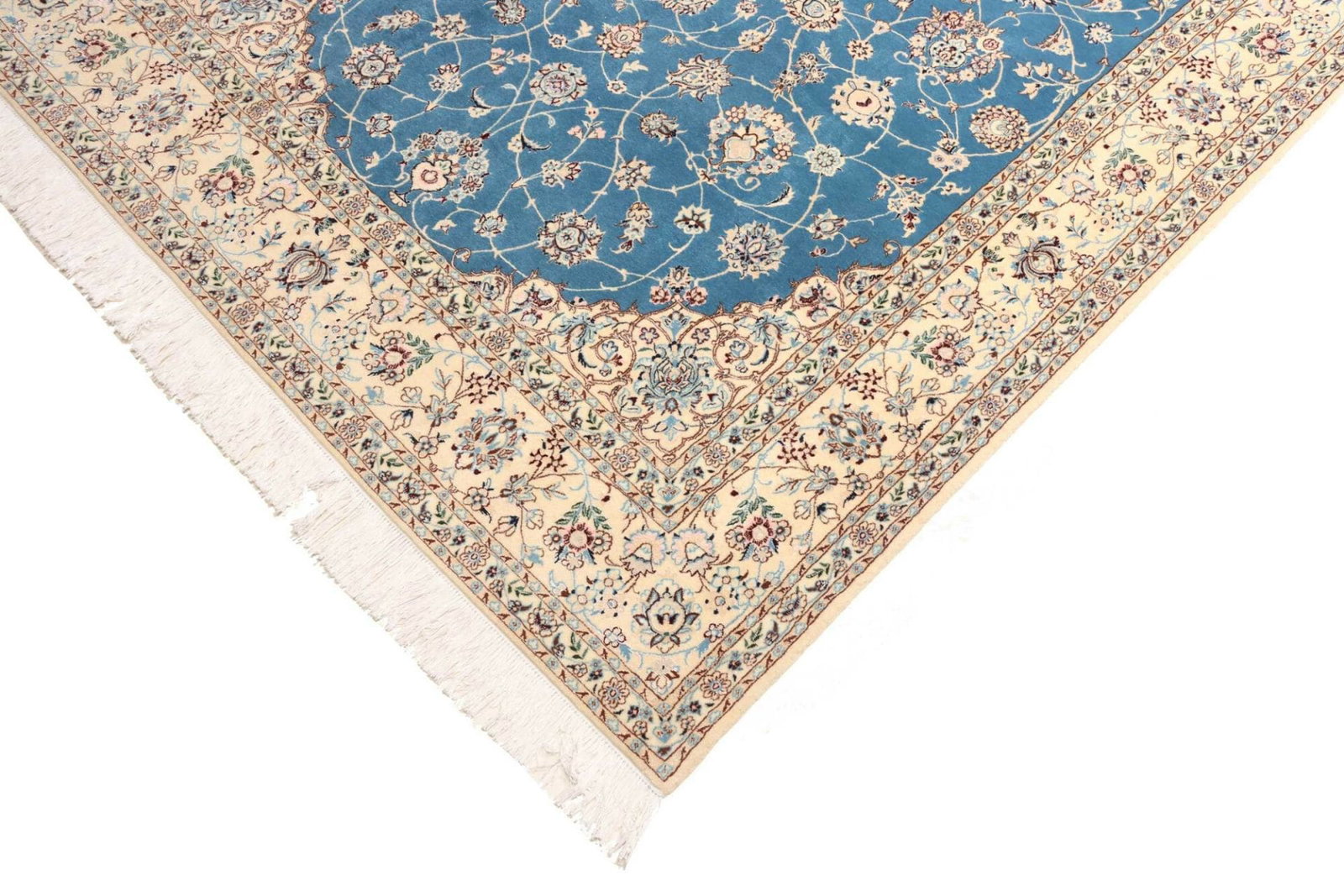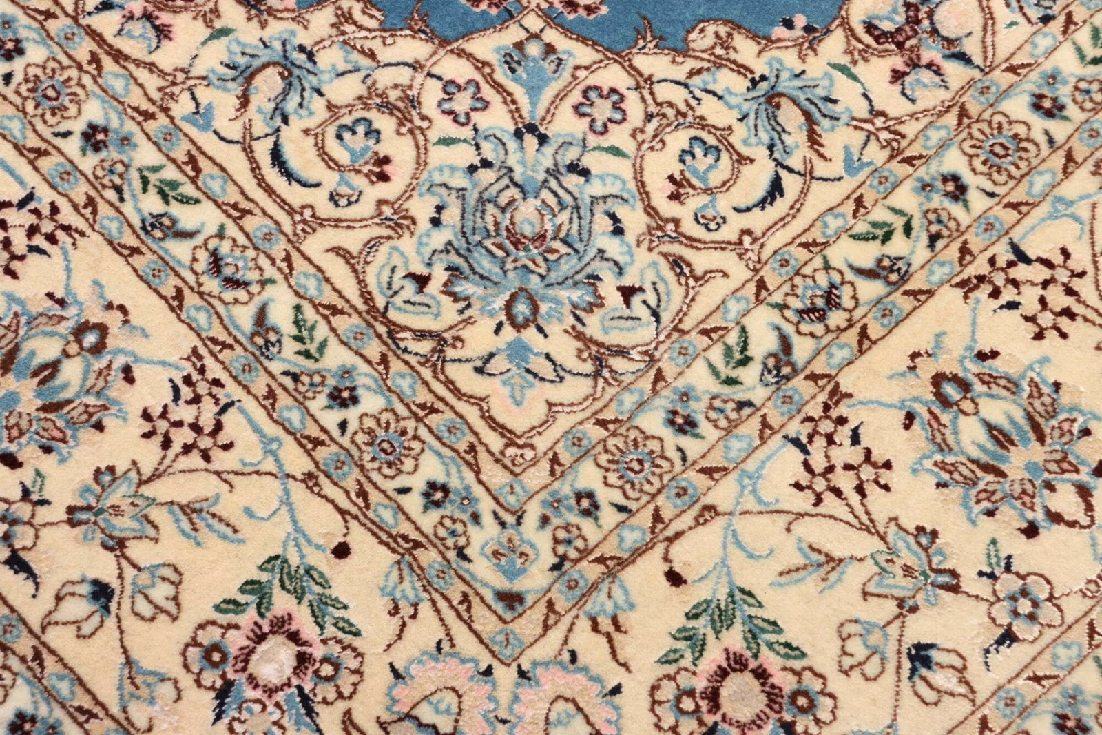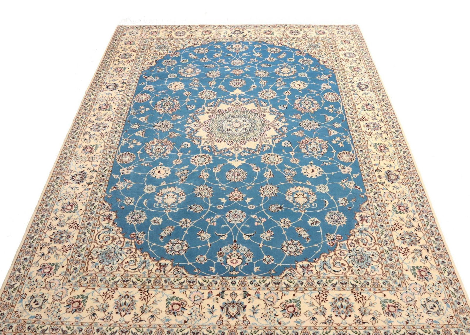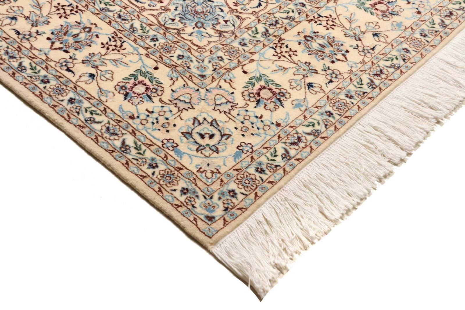 Nain Teppich | Knotendichte: ca. 900.000 Knoten/m² | Material: 100% Schurwolle im Flor, 100% Baumwolle in der Kette | Größe: 170 x 255 cm | Zustand: Handgeknüpft und in ausgezeichnetem Zustand | Ursprung: Iran | Muster: Klassische florale Motive in hellem Grundton mit königsblauen Akzenten