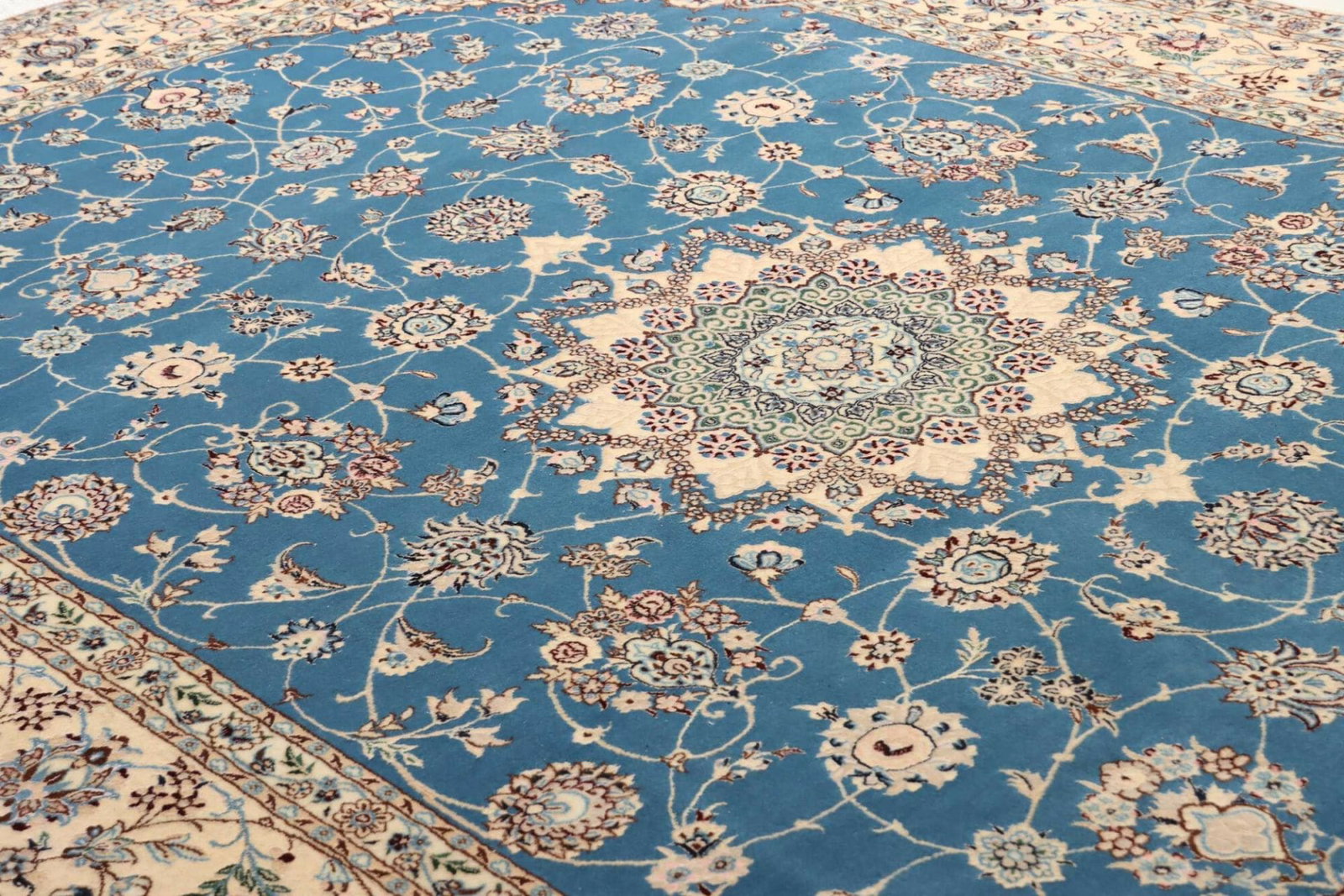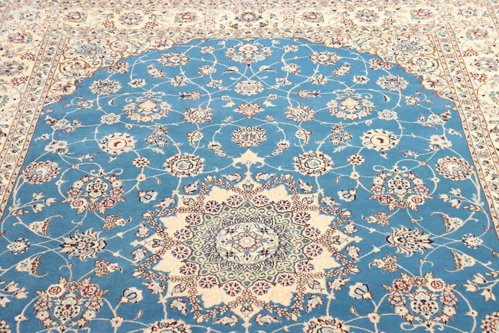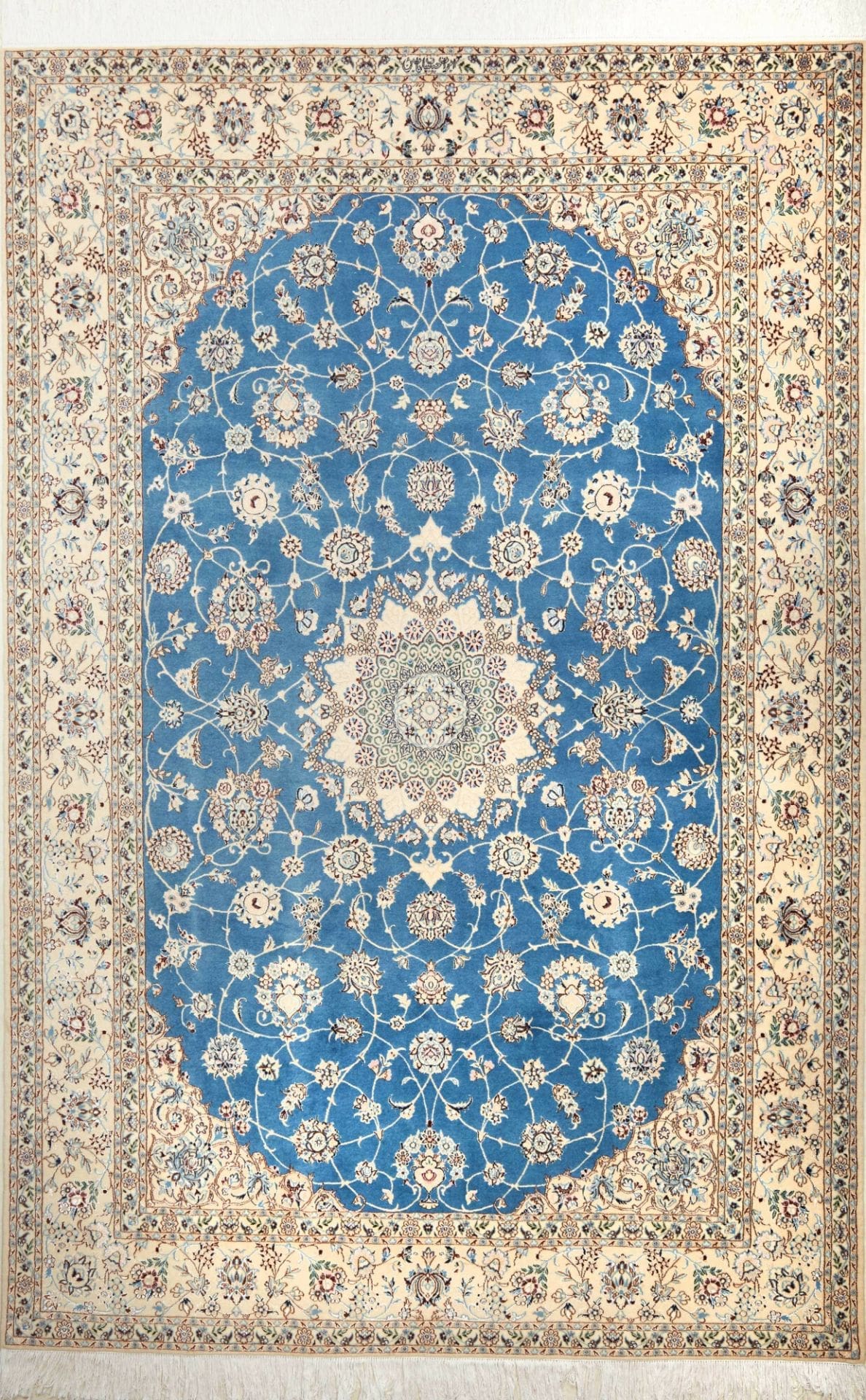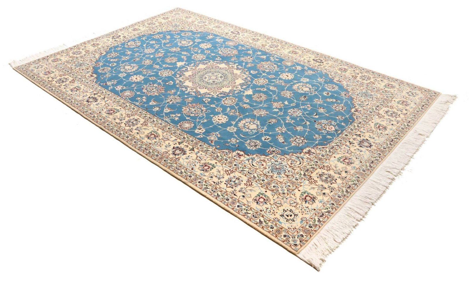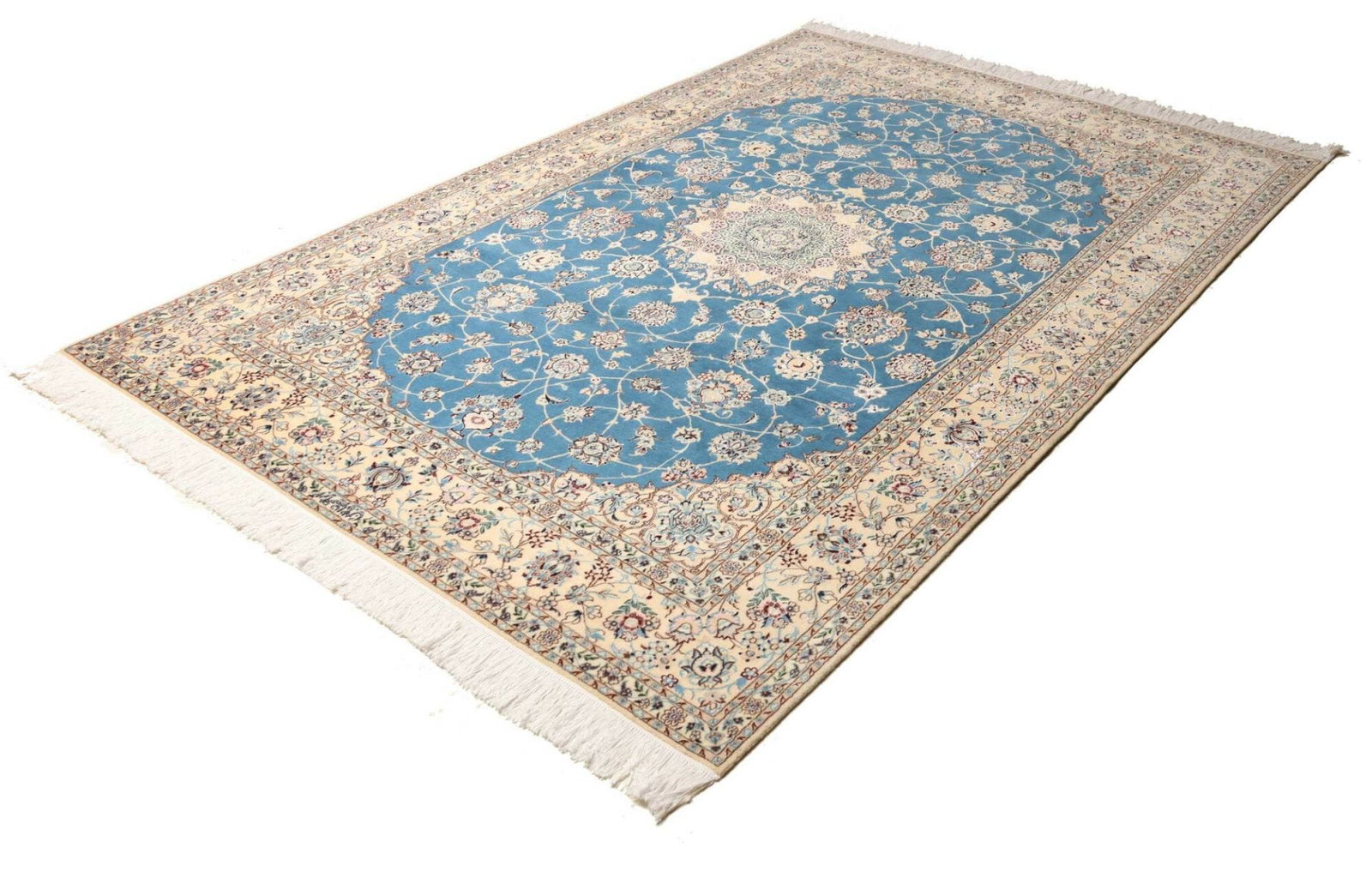 Nain Teppich | Knotendichte: ca. 900.000 Knoten/m² | Material: 100% Schurwolle im Flor, 100% Baumwolle in der Kette | Größe: 170 x 255 cm | Zustand: Handgeknüpft und in ausgezeichnetem Zustand | Ursprung: Iran | Muster: Klassische florale Motive in hellem Grundton mit königsblauen Akzenten