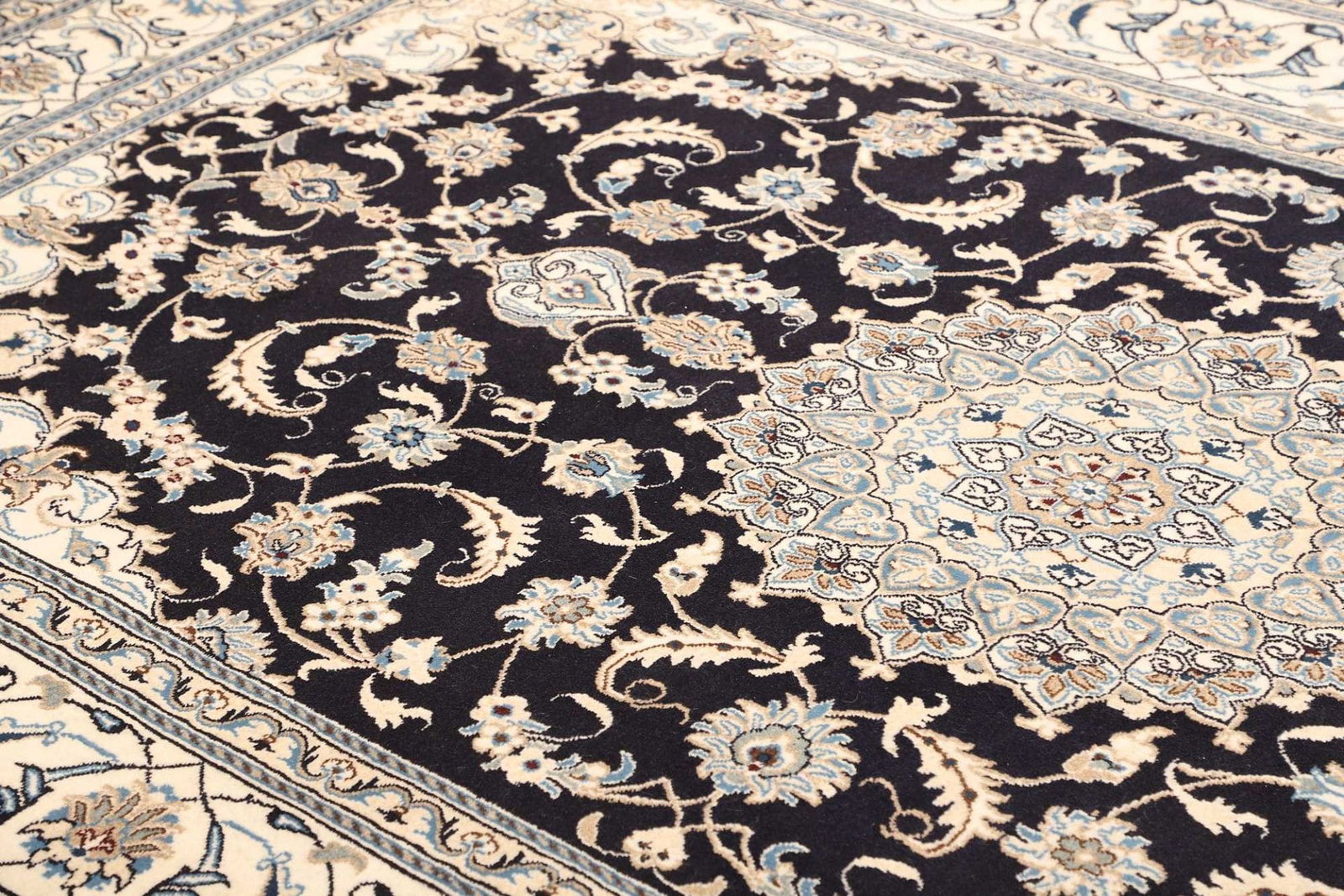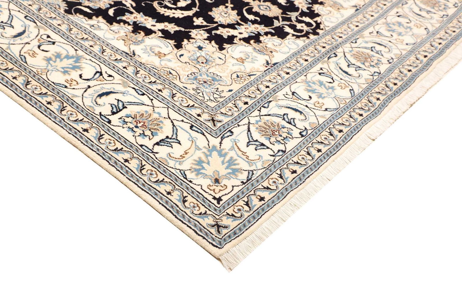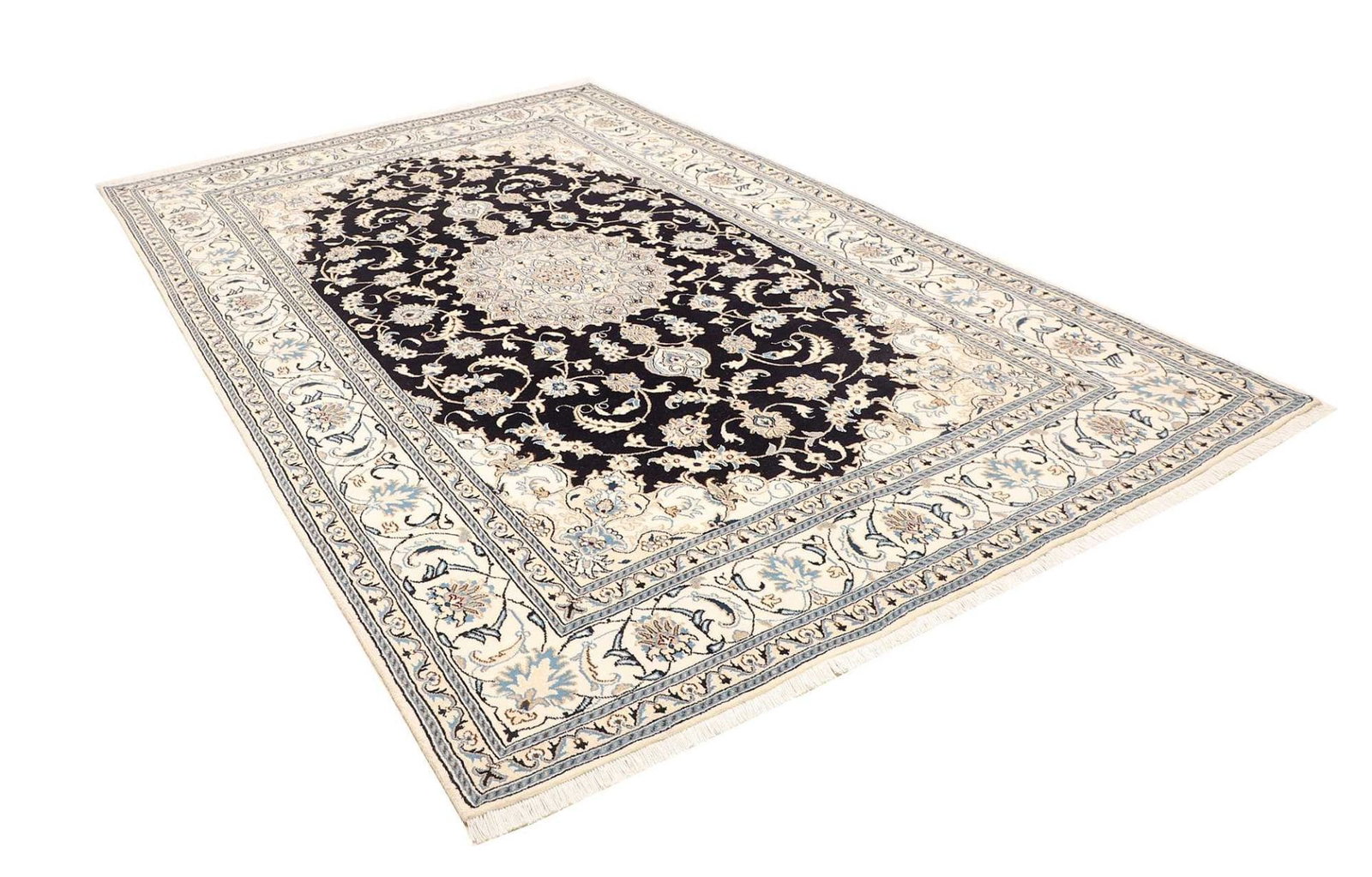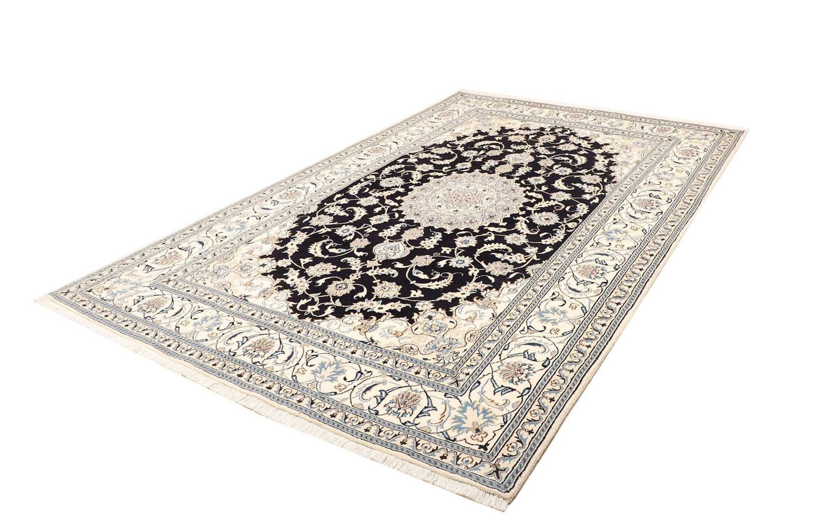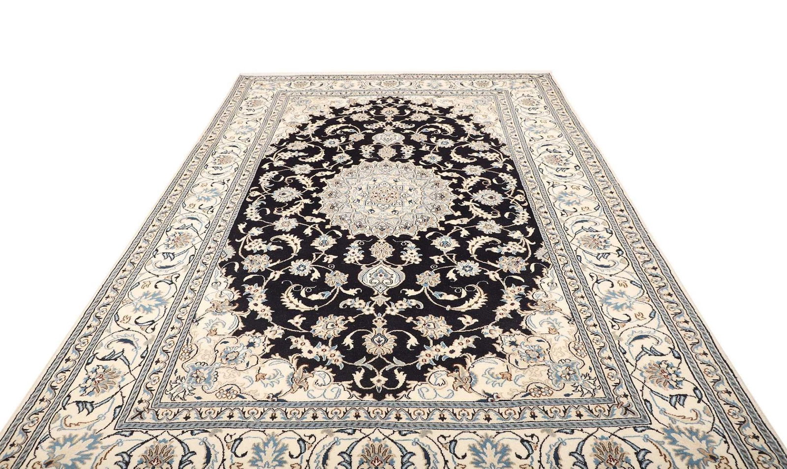 2308$Ursprünglicher Preis war: 2308$1948$Aktueller Preis ist: 1948$Nain Teppich | Knotendichte: ca. 200.000 Knoten/m² | Material: 100% Schurwolle (Flor), 100% Baumwolle (Kette) | Größe: 186 x 305 cm | Herkunft: Iran | Zustand: Handgeknüpft, exklusive Qualität | Muster: Klassische florale Motive mit königsblauem Akzent