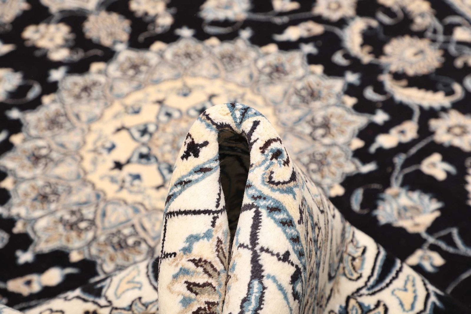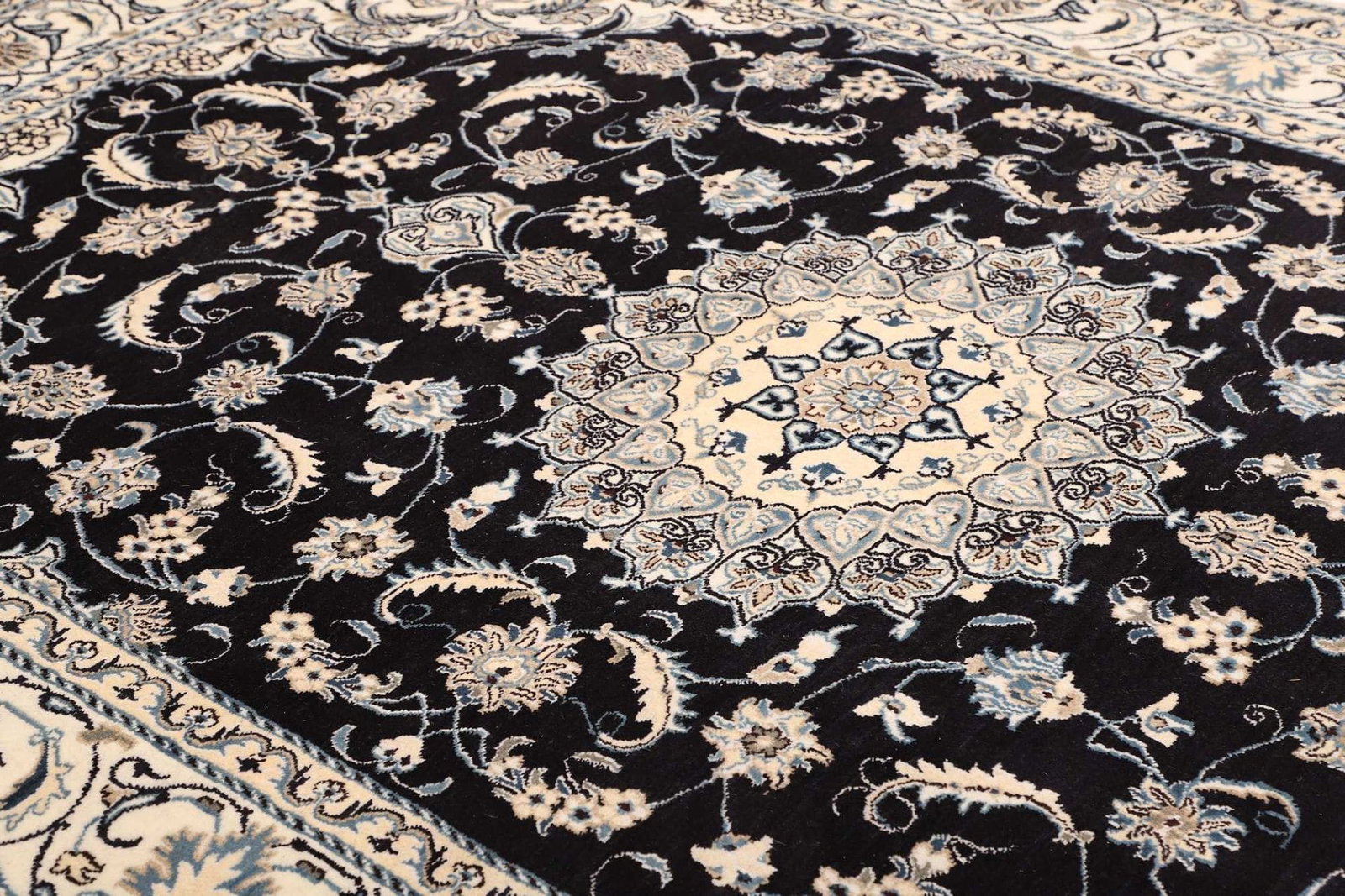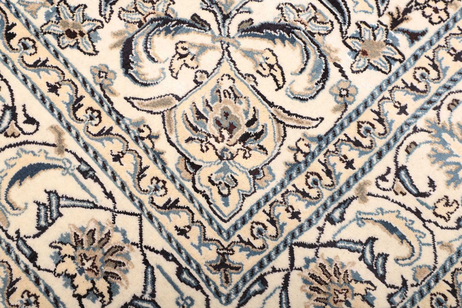 Der Nain Teppich besteht aus edlen Materialien, die für ihre Langlebigkeit und Farbbeständigkeit bekannt sind. Die Verwendung von Schurwolle sorgt für eine angenehme Haptik und einen warmen, einladenden Look. Da der Teppich handgeknüpft ist, verfügt er über eine hohe Knotendichte, die sich positiv auf die Qualität und Langlebigkeit auswirkt. Bei einem solchen Teppich kann man von einer Knotendichte von mehreren Hundert Knoten pro Quadratmeter sprechen, was eine exzellente Verarbeitung garantiert. Diese Detailgenauigkeit hat zur Folge, dass die floralen Muster lebendig wirken und die Schönheit des Teppichs betonen.