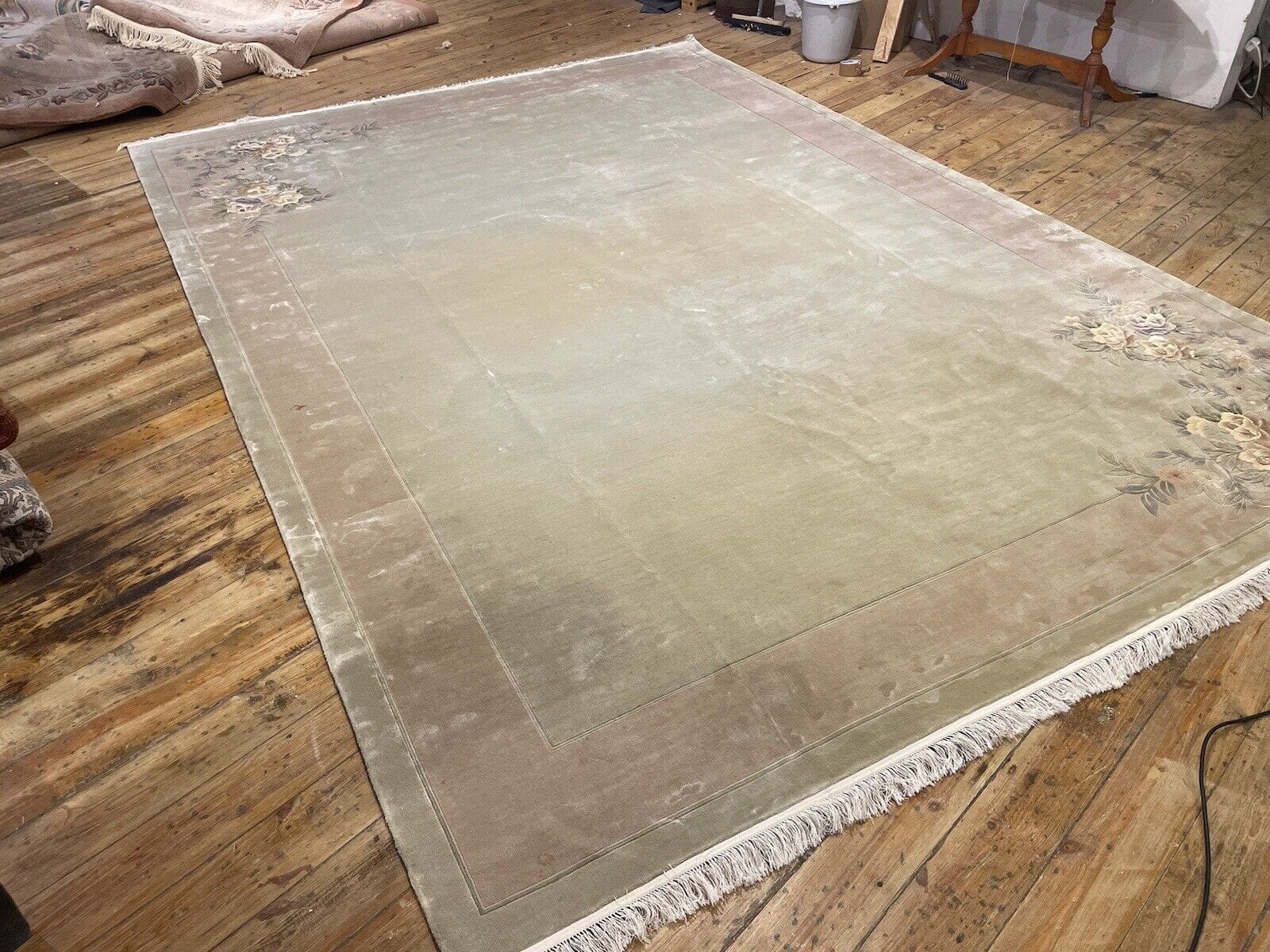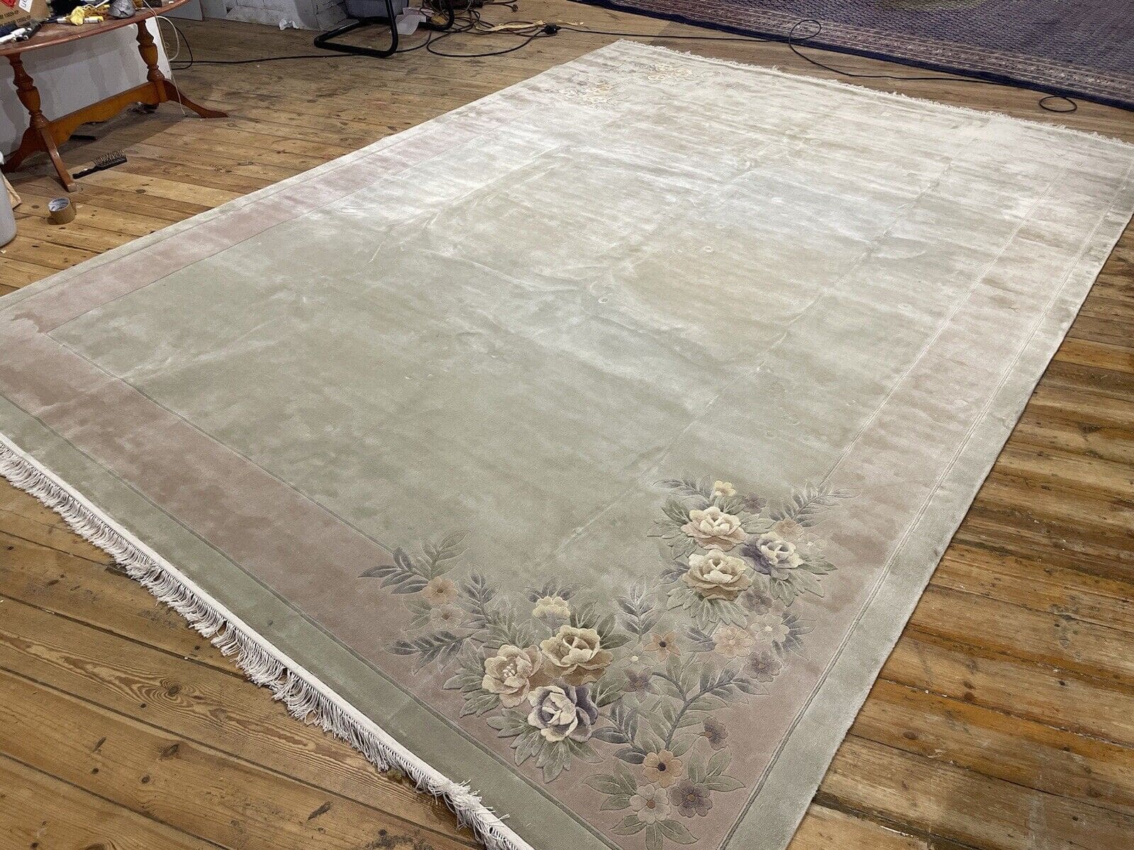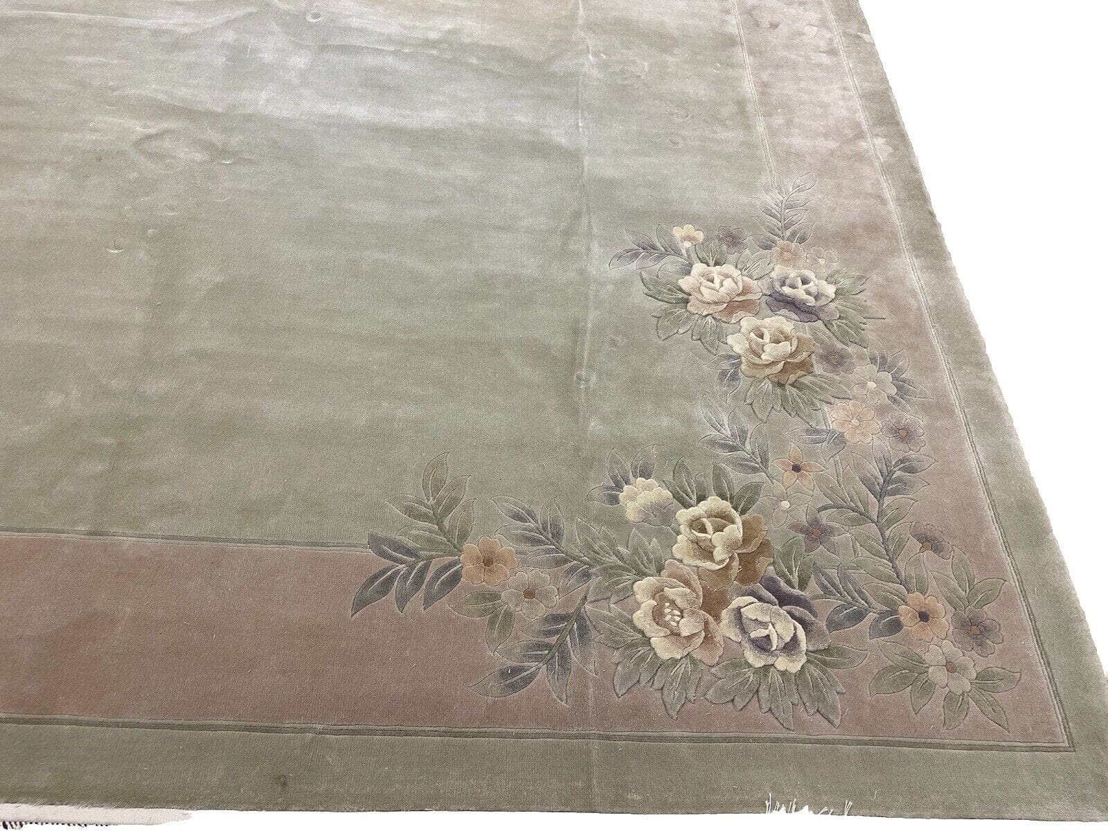 Der zeitlose Charakter dieses Teppichs wird durch das klassische chinesische Muster unterstrichen. Typische Motive sind florale Designs, die harmonisch miteinander verwoben sind. Diese Symbole stehen häufig für Glück, Wohlstand und Wohlbefinden und sind ein integraler Bestandteil der traditionellen chinesischen Ästhetik. Das sanfte Beigegrün schafft eine beruhigende Atmosphäre in Ihrem Interieur, während die reichhaltigen Muster das Auge anziehen und Gesprächsstoff bieten.