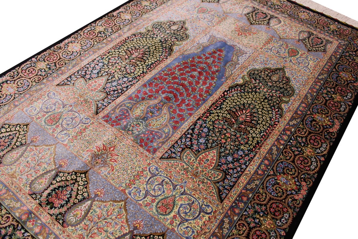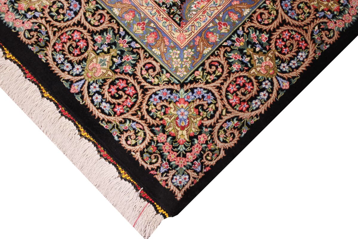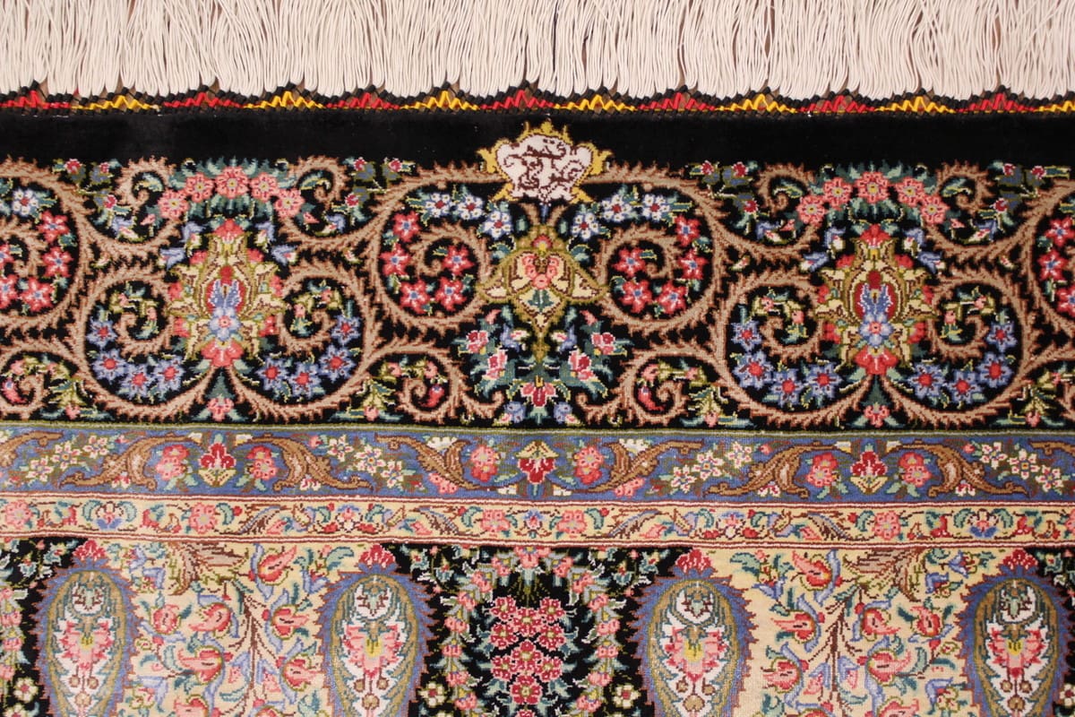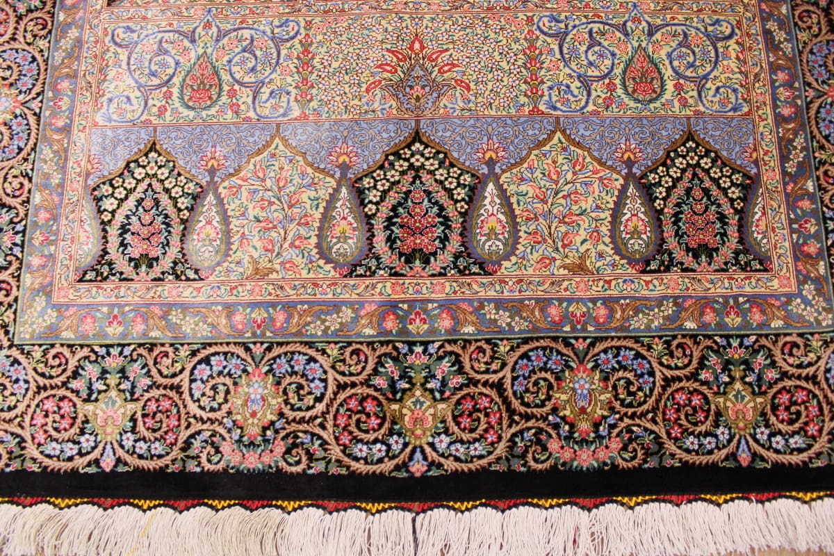 Exklusiver schwarzer Seidenteppich | Knotendichte: Sehr hoch, fast 1000000 Knoten pro Quadratmeter | Material: Hochwertige Seide | Größe: 155×101 cm | Zustand: Ausgezeichnet | Ursprung: Gom Teppichtradition | Muster: Vielfältige Motive wie Gartenteppiche, Jagdschilderungen und Vasenmuster | Farbpalette: Harmonische Naturfarben, überwiegend Elfenbein und Rot