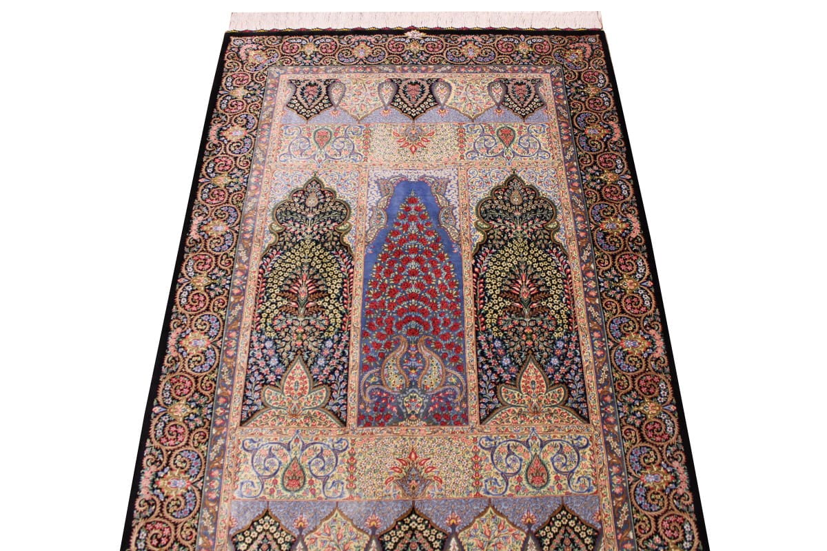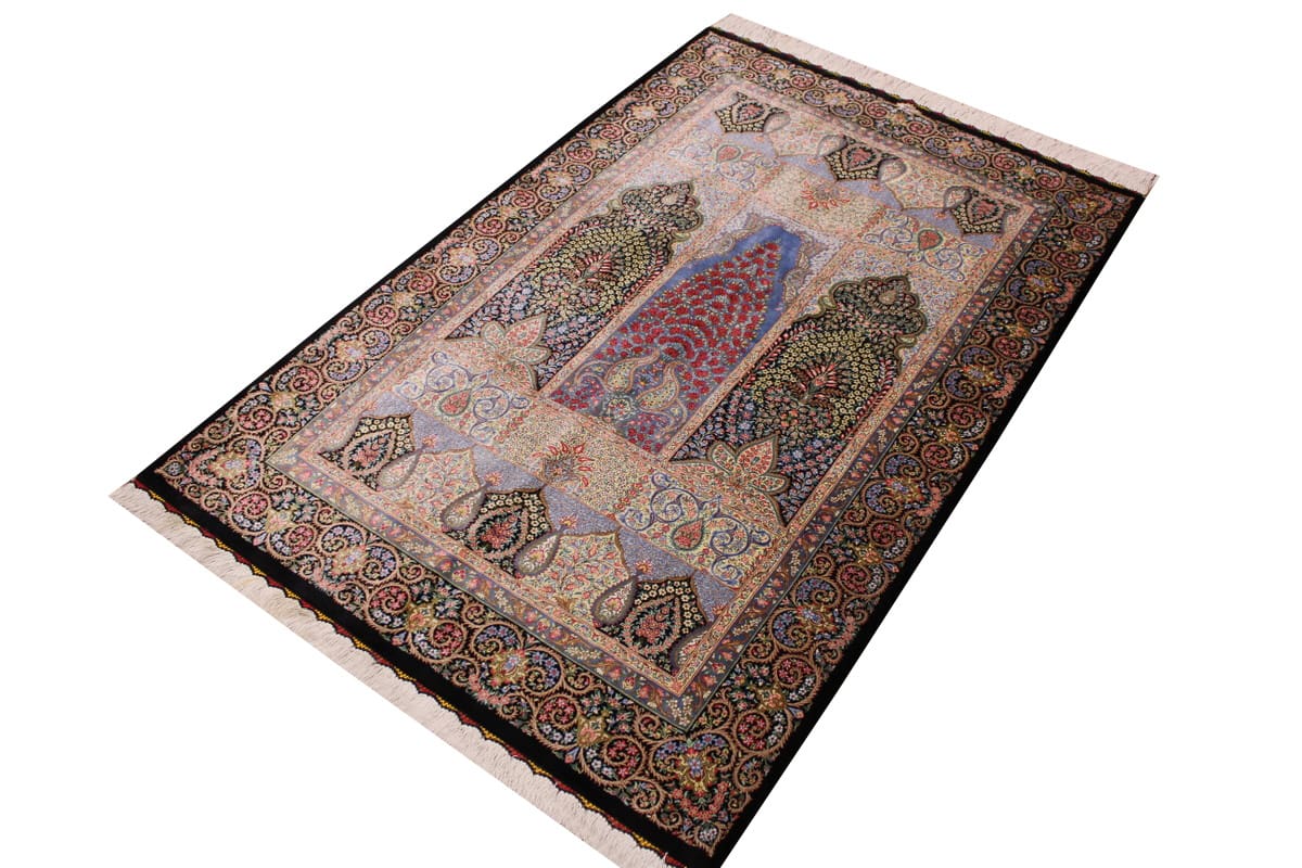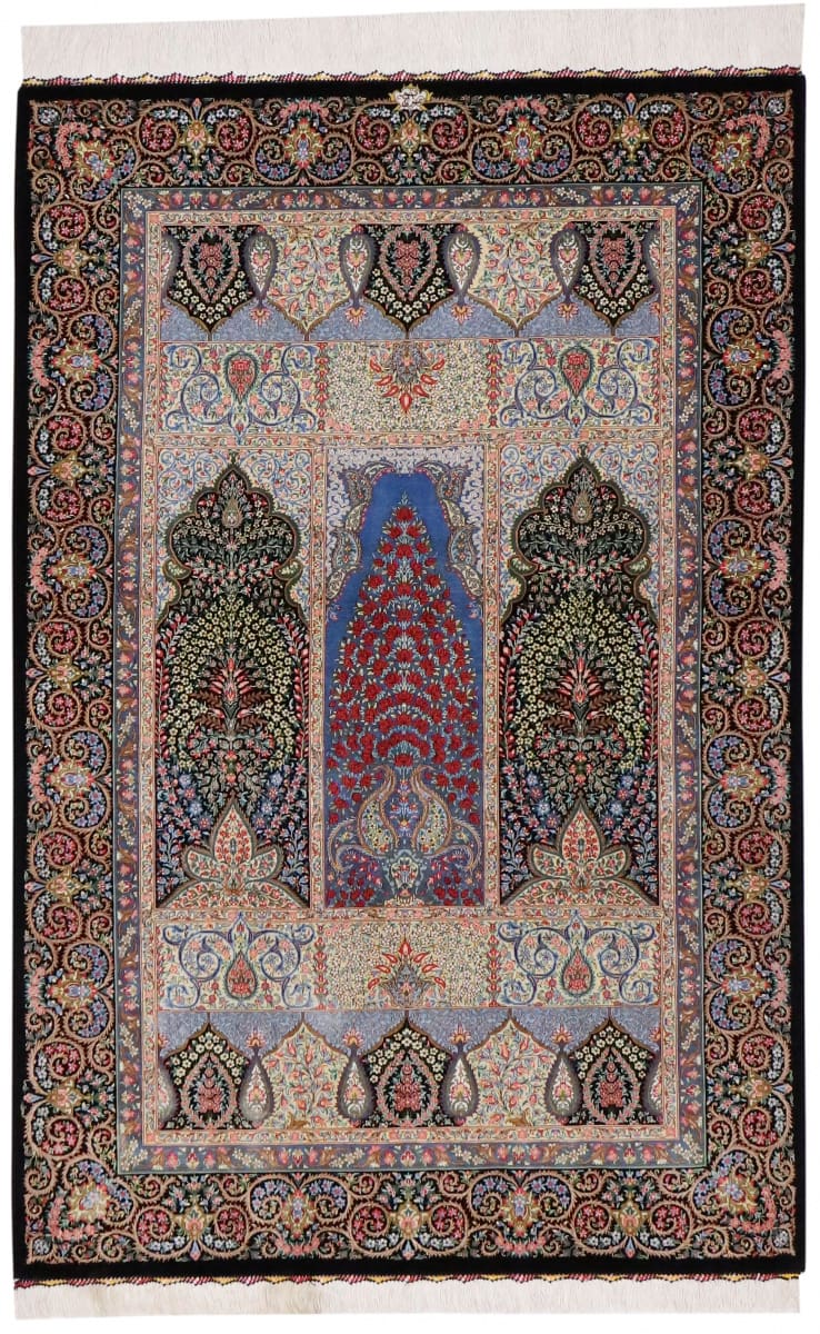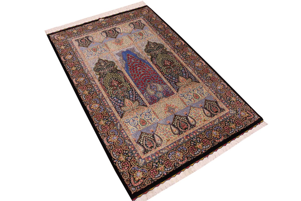 Exklusiver schwarzer Seidenteppich | Knotendichte: Sehr hoch, fast 1000000 Knoten pro Quadratmeter | Material: Hochwertige Seide | Größe: 155×101 cm | Zustand: Ausgezeichnet | Ursprung: Gom Teppichtradition | Muster: Vielfältige Motive wie Gartenteppiche, Jagdschilderungen und Vasenmuster | Farbpalette: Harmonische Naturfarben, überwiegend Elfenbein und Rot