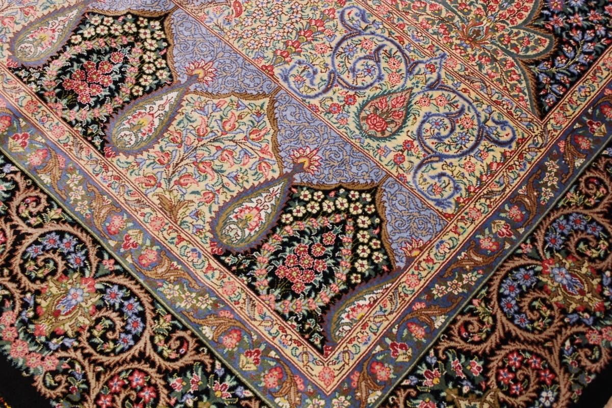 Entdecken Sie den exklusiven schwarzen Seidenteppich, der nicht nur ein elegante Bereicherung für Ihr Zuhause darstellt, sondern auch kunstvoll in traditioneller handgeknüpfter Technik gefertigt wurde. Mit harmonischen Naturfarben verleiht dieser Teppich jedem Raum eine edle Note und sorgt für eine angenehme Atmosphäre. Hergestellt aus hochwertigster Seide, bietet dieser Teppich nicht nur eine außergewöhnliche Haptik, sondern auch eine unvergleichliche Langlebigkeit. Seide ist bekannt für ihre Strapazierfähigkeit und ihren brillanten Glanz, der ihn von anderen Teppichen abhebt.