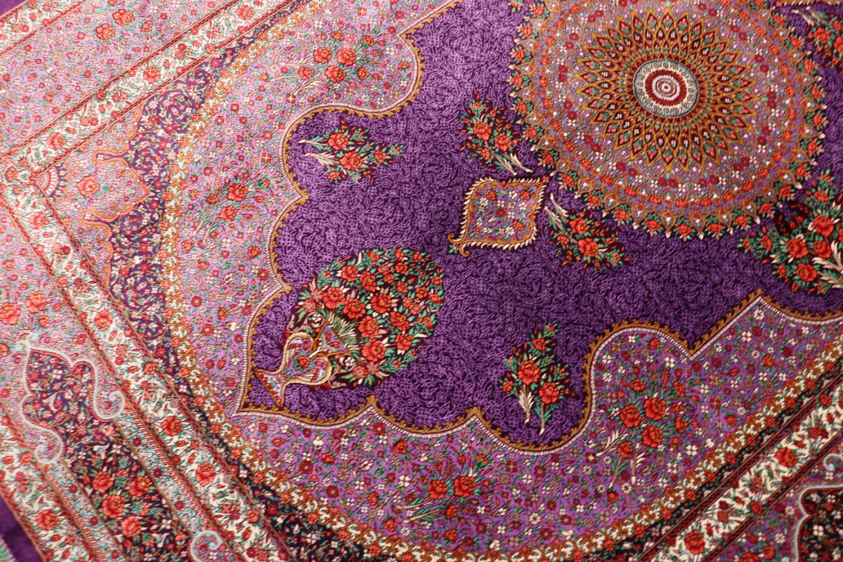 Das Design des exklusiven Seidenteppichs Ghom besticht durch seine harmonische Zusammenstellung von Farben und Mustern. Die lila Nuancen werden kunstvoll mit eleganten Designs kombiniert, die oft florale und geometrische Motive umfassen. Diese Muster haben nicht nur ästhetischen Wert, sondern sind auch symbolisch aufgeladen – sie erzählen Geschichten über Natur, Leben und die kulturellen Wurzeln der Region. Das Zusammenspiel von Farbe und Form macht den Teppich zu einem zeitlosen Kunstwerk, das sowohl in klassischen als auch in modernen Einrichtungsstilen wunderbar zur Geltung kommt.