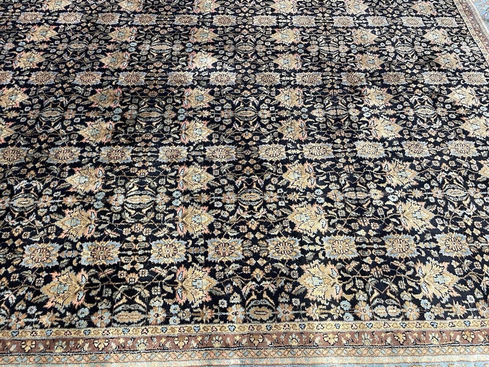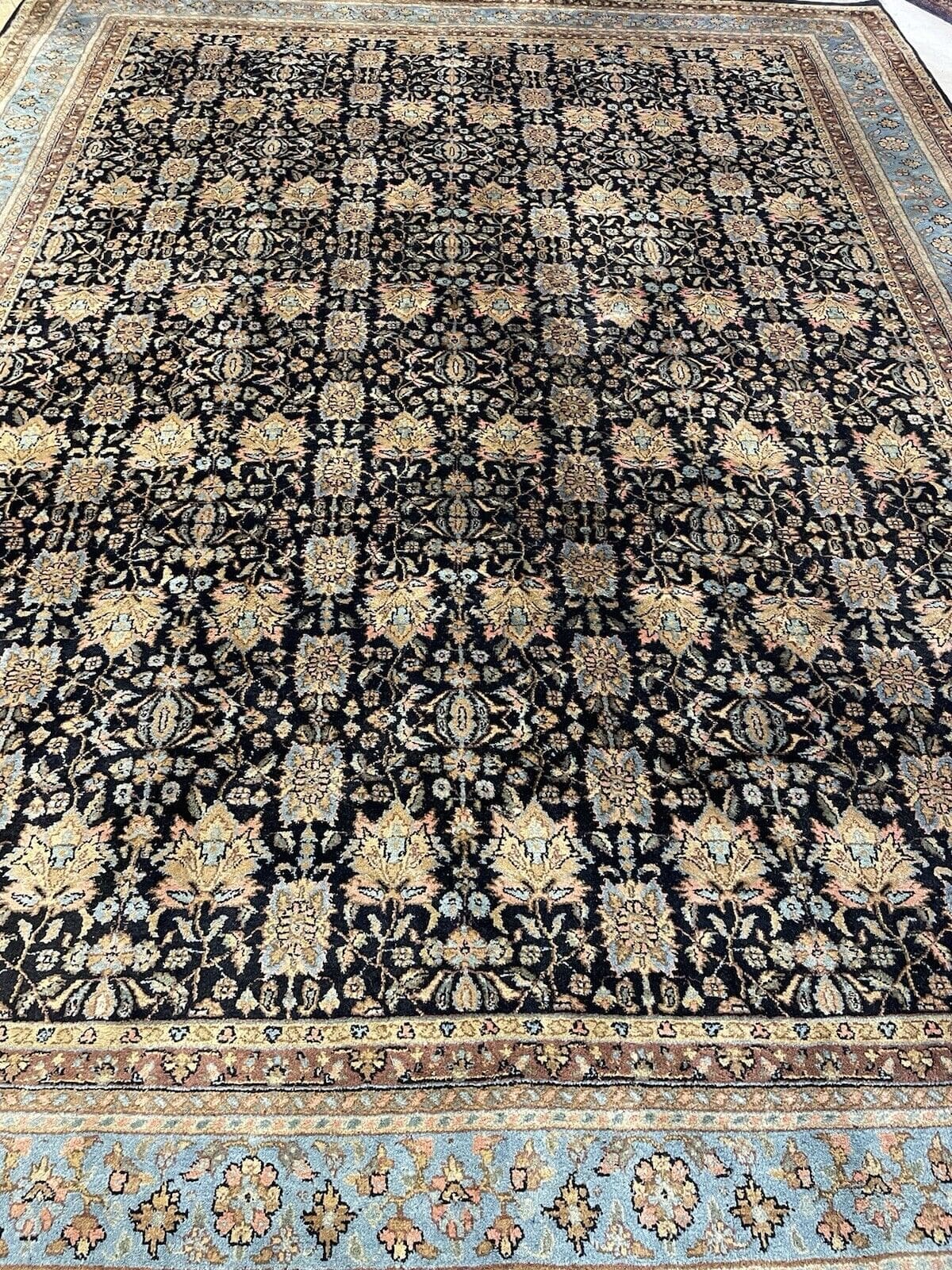 Exquisiter handgeknüpfter Perserteppich 350x255cm – Extrem feine Kashmir Wolle in traditionellem Alt Blau, 100% reine Schurwolle, Kett- und Schussfäden aus Baumwolle, handgeknüpft