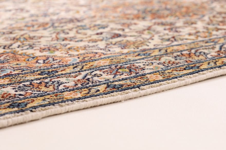 Kaschmir-Seidenteppich | Knotendichte: 440.000 – 490.000 Knoten/m² | Material: 100% reine Seide | Größe: 108×61 cm | Farbe: Weiß/Beige | Zustand: Neu | Ursprung: Indien | Verarbeitung: Handgeknüpft | Flor: Seide | Dicke: ca. 4 mm | Gewicht: ca. 2 kg
