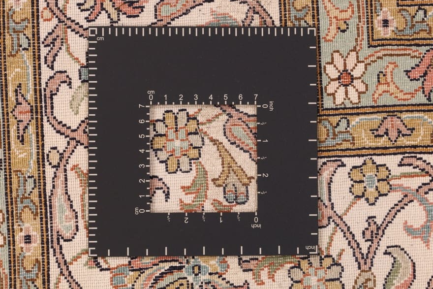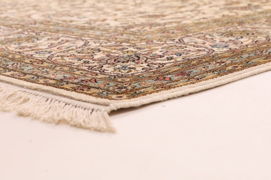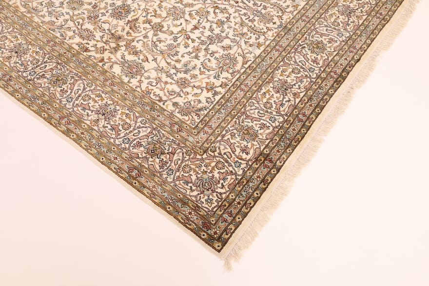 Exquisiter Kaschmir-Seidenteppich | Knotendichte: 440.000-490.000 Knoten/m² | Material: Reine Seide | Größe: 308×211 cm | Herkunft: Indien | Zustand: Neu | Farbe: Weiß/Beige | Verarbeitung: Handgeknüpft | Florhöhe: ca. 4 mm | Gewicht: ca. 26 kg