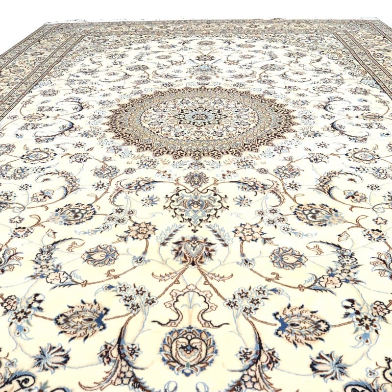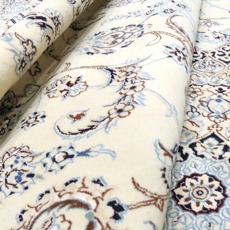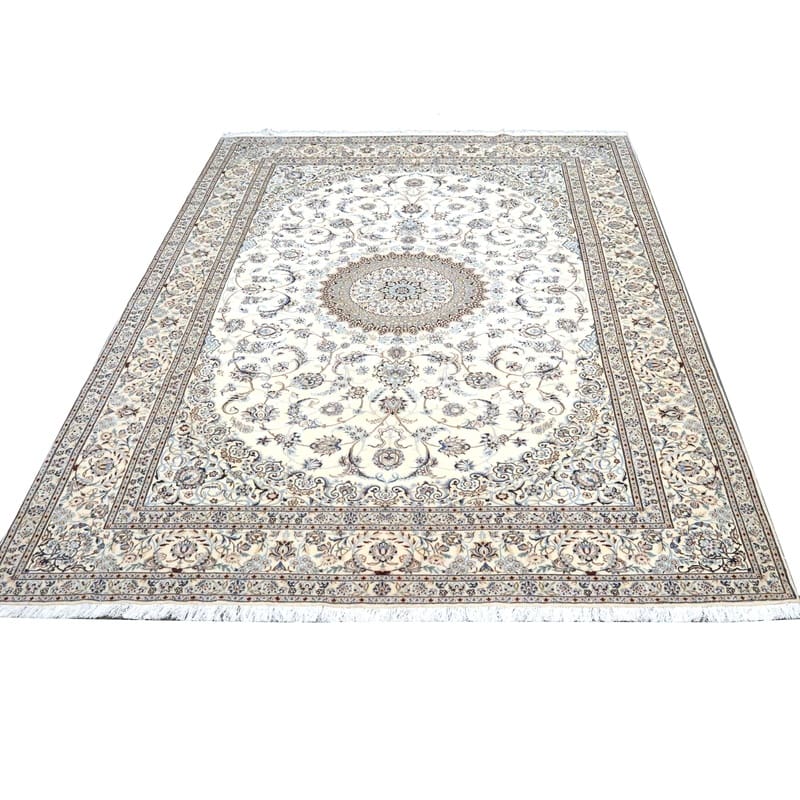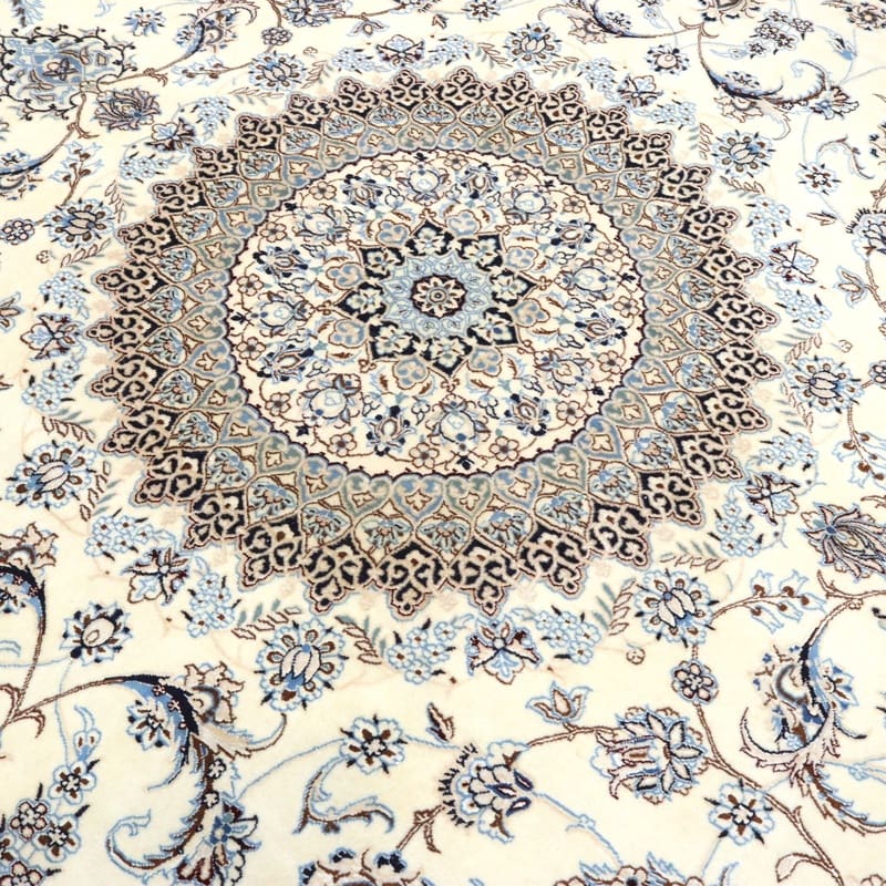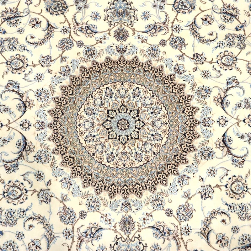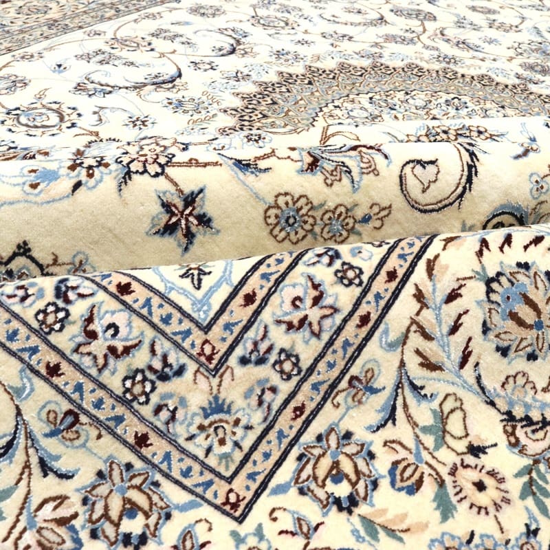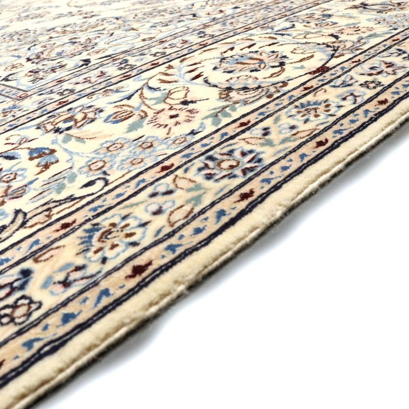 Nain 6 La Teppich | Knotendichte: 640.000 Knoten/m² | Material: Wolle und Seide | Größe: 367×248 cm | Farbe: Elfenbein mit floralen Mustern in Blau, Beige und Braun | Zustand: Neu | Ursprung: Iran / Persien | Verarbeitung: Handgeknüpft | Dicke: ca. 8 mm | Gewicht: ca. 26 kg