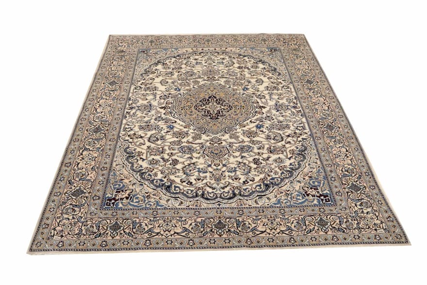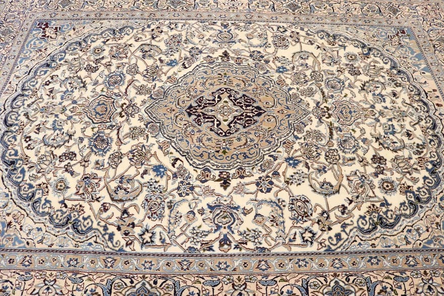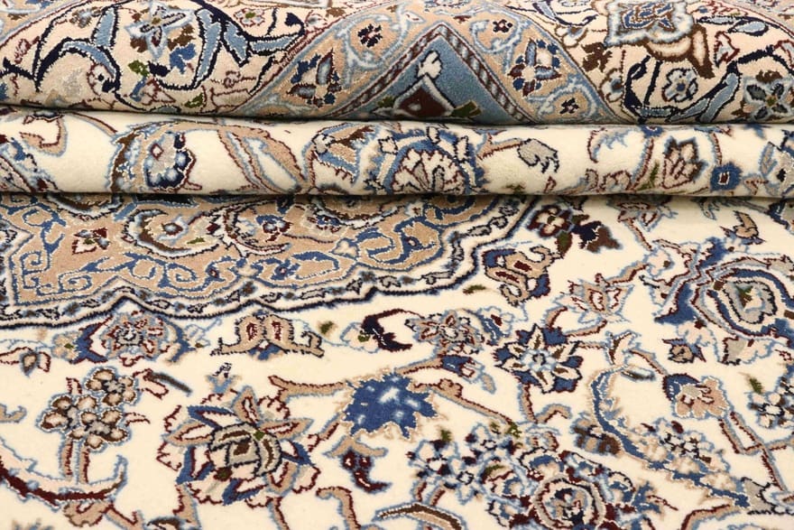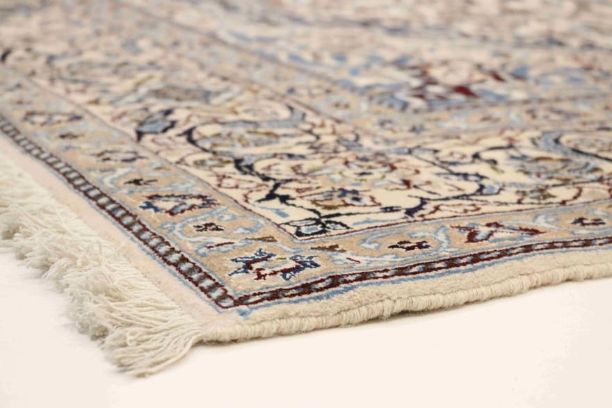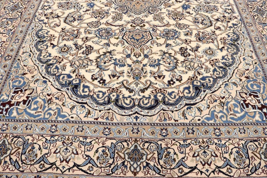 Nain 9 La Teppich | Knotendichte: 360.000 Knoten/m² | Material: Wolle und Seide | Größe: 301×210 cm | Farbe: Elfenbein mit floralen Mustern | Zustand: Neu | Ursprung: Iran | Verarbeitung: Handgeknüpft | Dicke: ca. 8 mm | Gewicht: ca. 16 kg